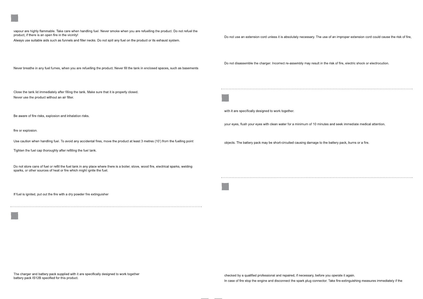 • If you have spilt fuel on yourself or on your clothes, change your clothes and wash any part of your body that has come in contact