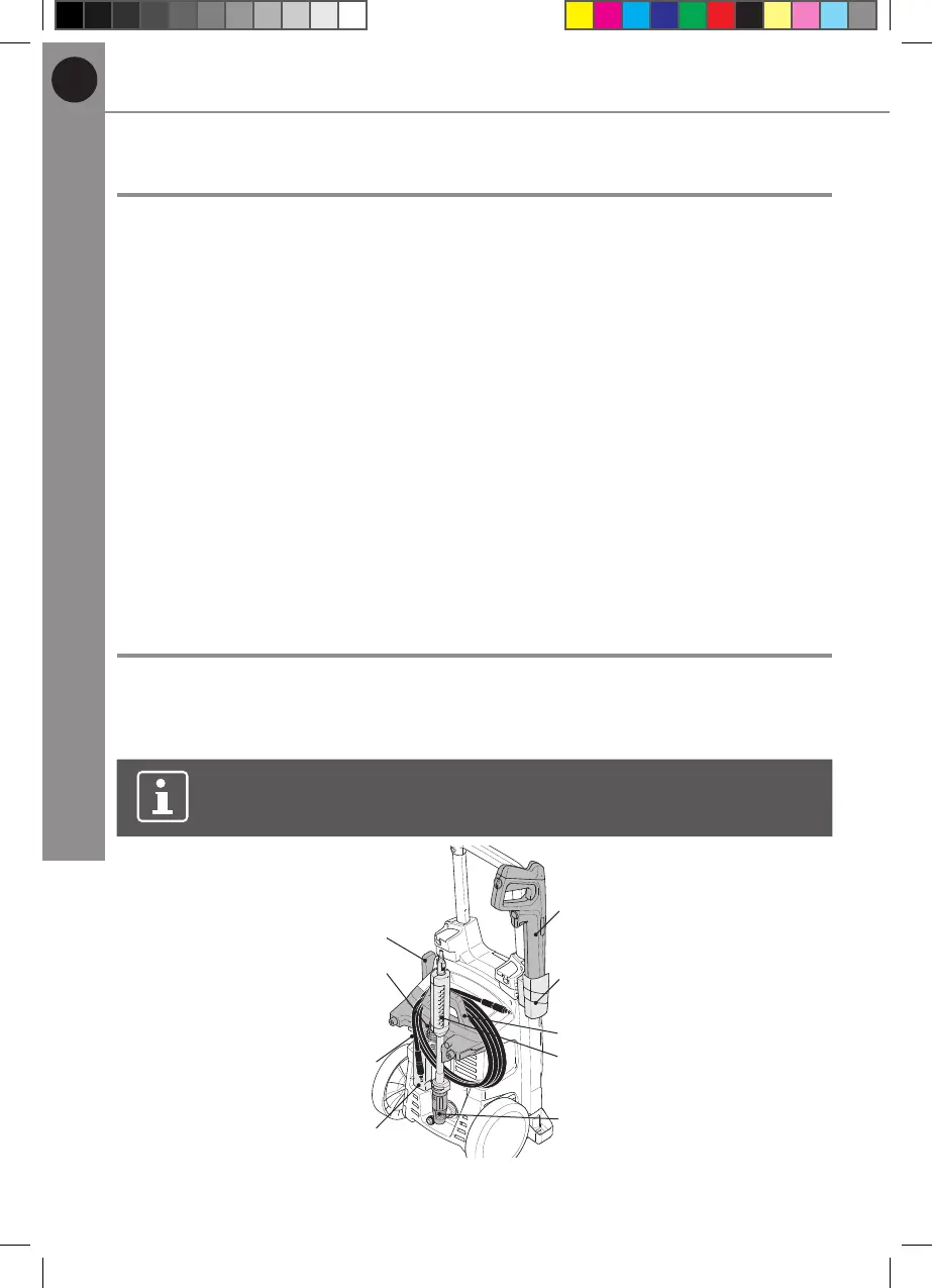 Utilisez le support de tuyau/poignée (10) pour ranger le tuyau haute pression (16)
