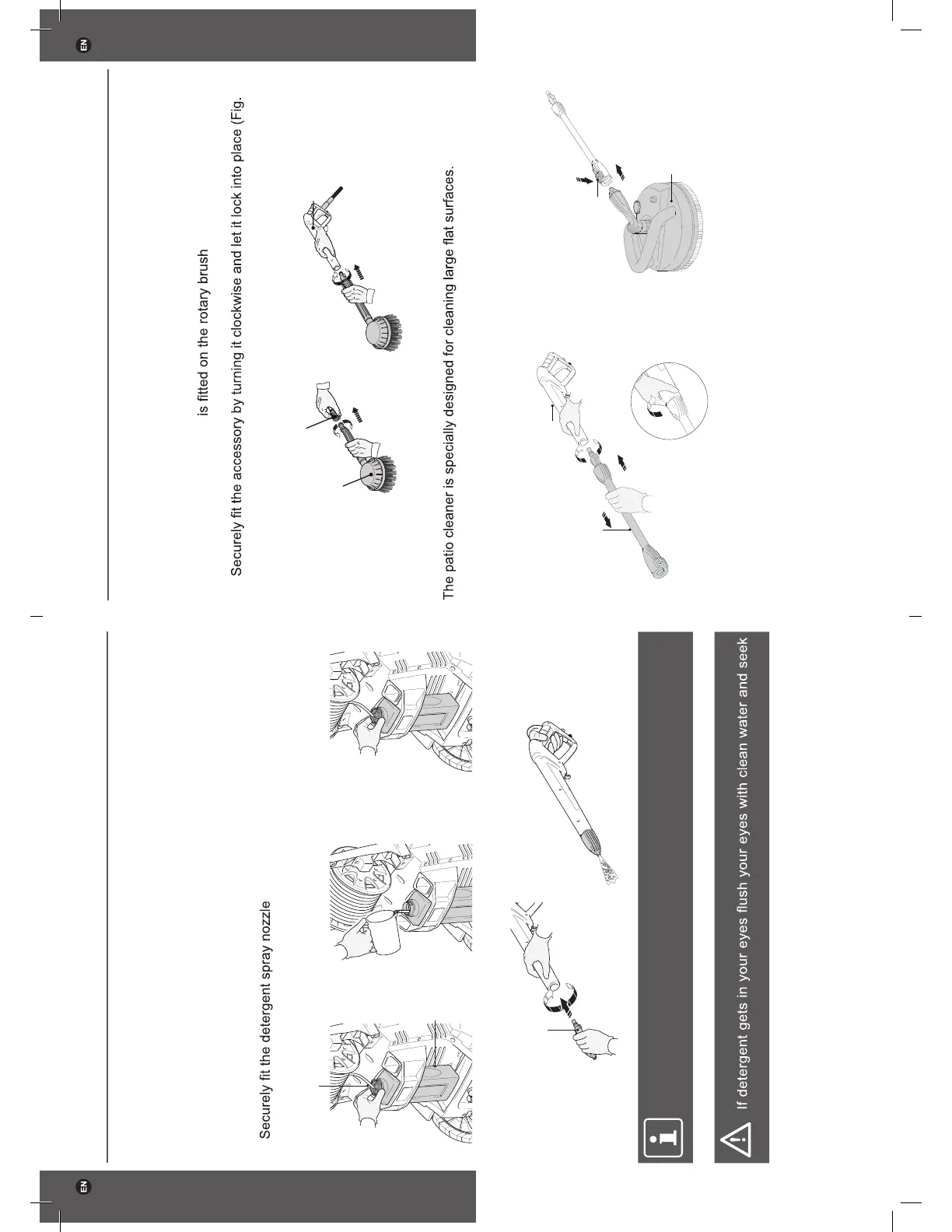 Use the detergent spray nozzle (20) to apply detergent. Some cleaning tasks can be