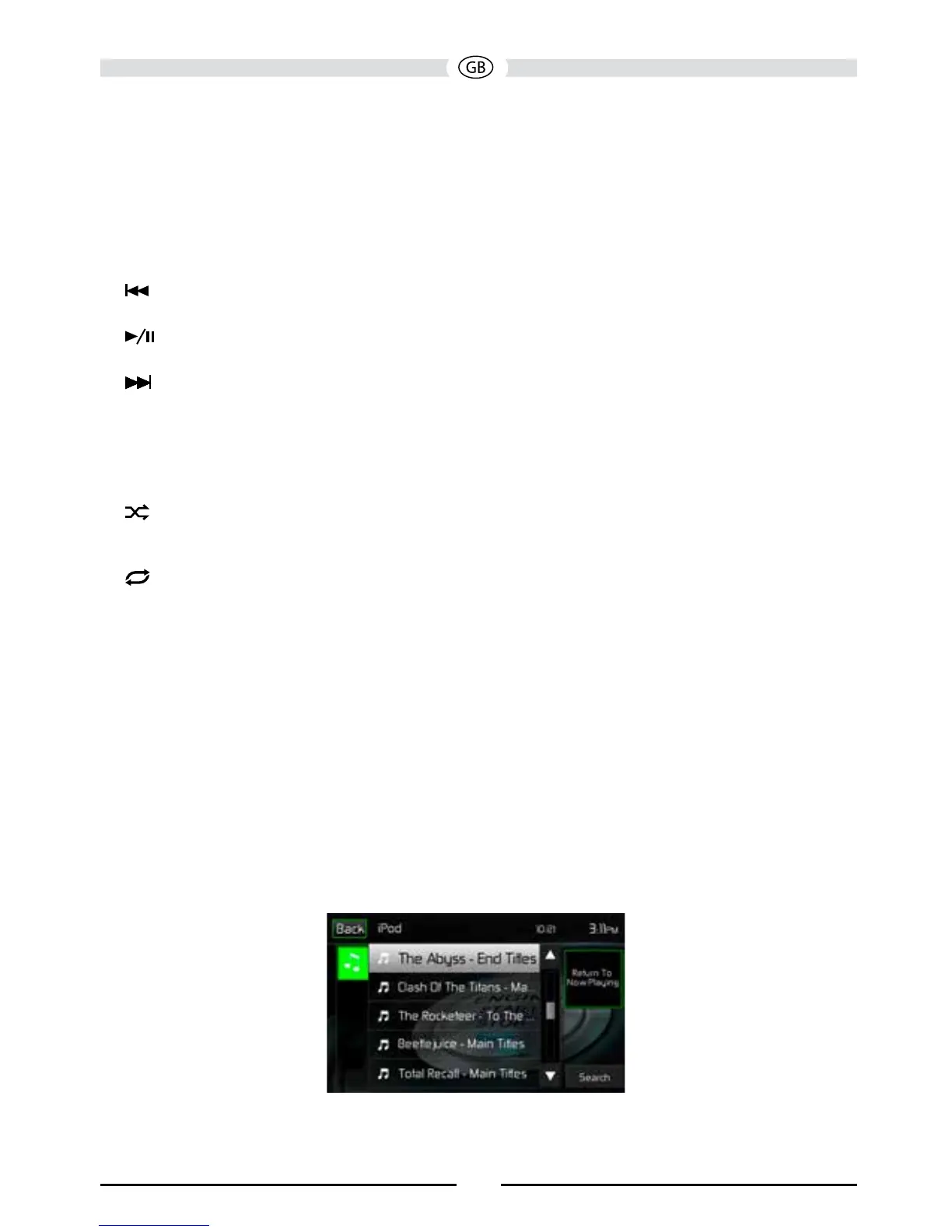 List: Touch this icon to access the list of audio les contained on the iPod®. Touch a folder icon