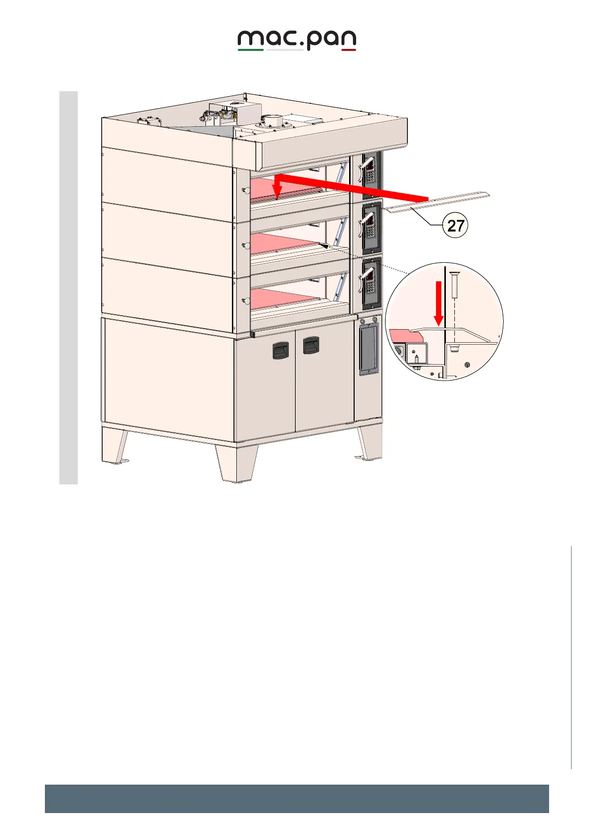 After inserting the baking plates, position and fix the sheet metal plate stoppers (Pos.27) using M6