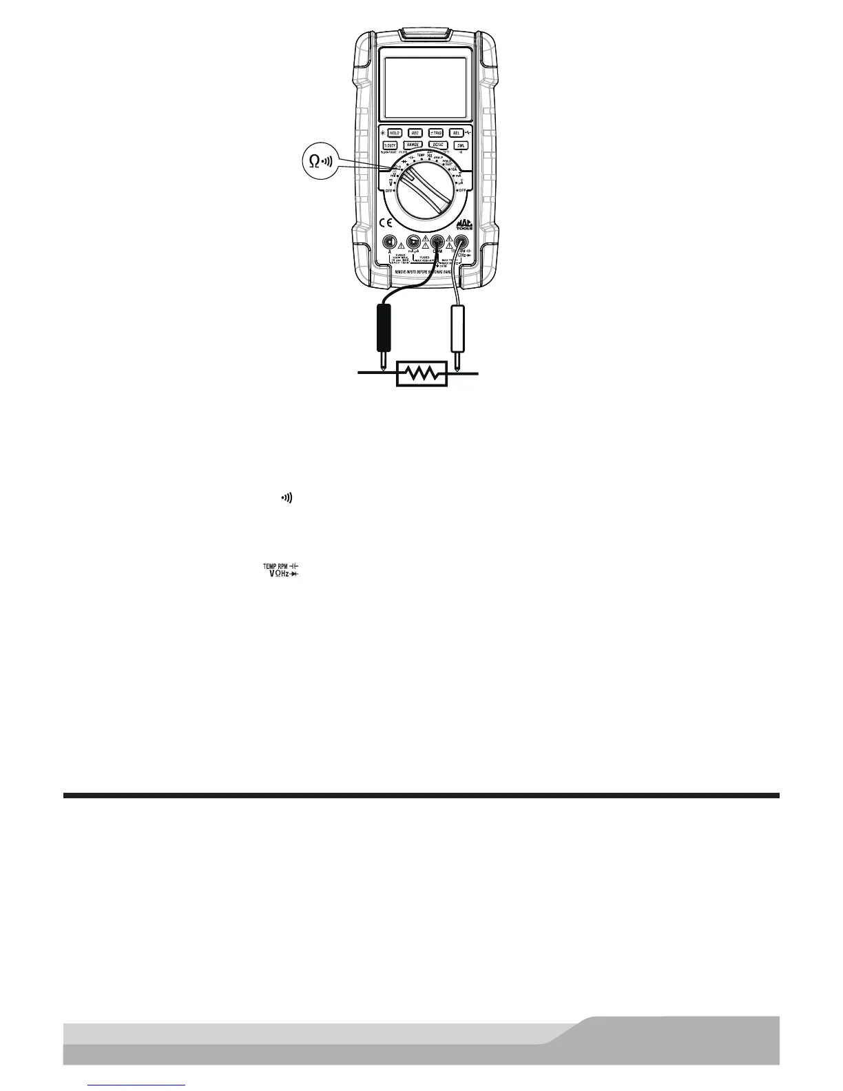 • Set the rotary switch to the Ω setting. The meter defaults to resistance measurement function.