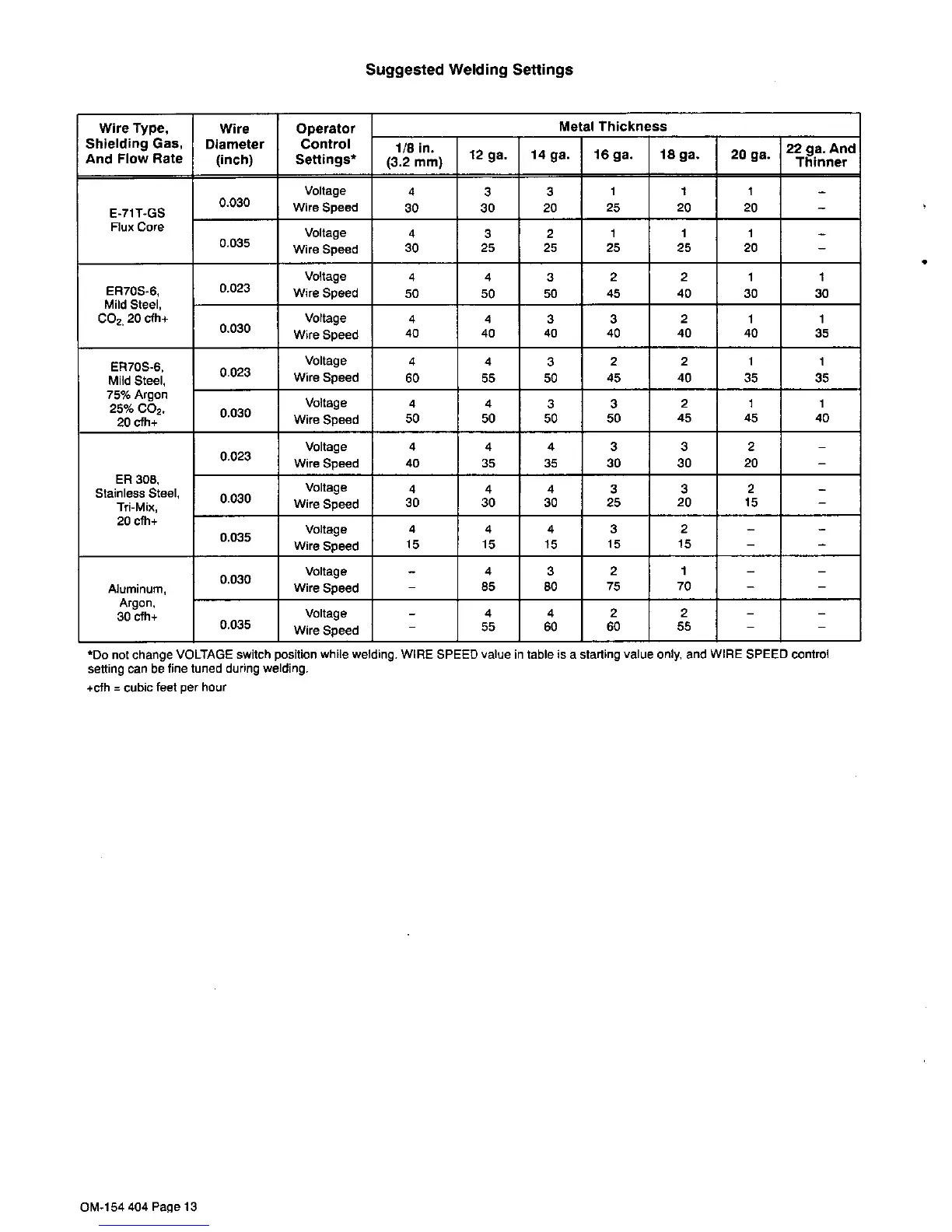 MAC TOOLS MW130 - Suggested Welding Settings; Welding Settings Table