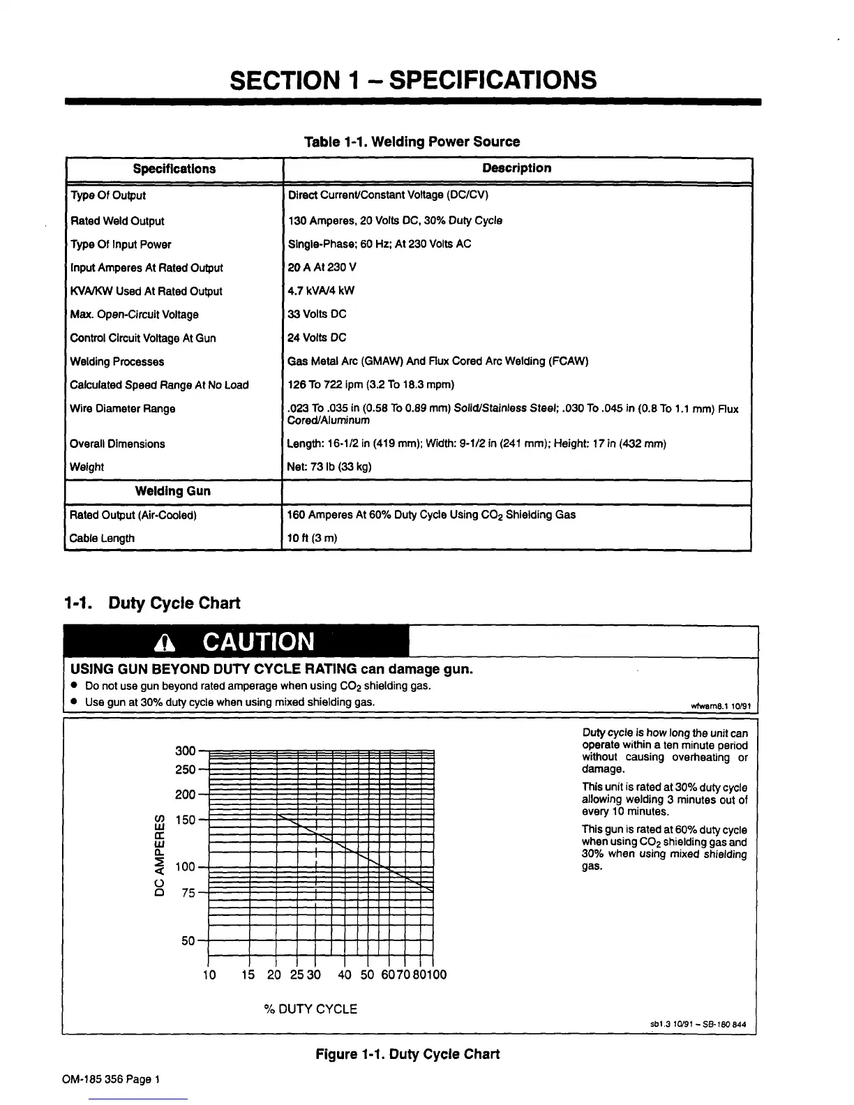 MAC TOOLS MW165 - Specifications; Welding Power Source; Duty Cycle Chart
