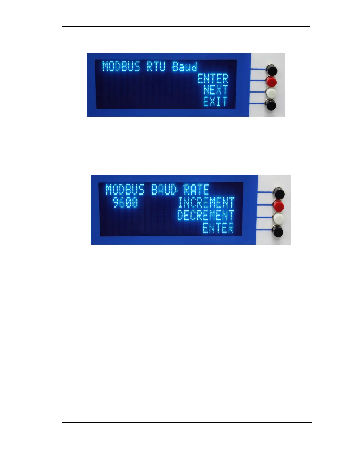 Use the INCREMENT and DECREMENT buttons to select the desired baud rate