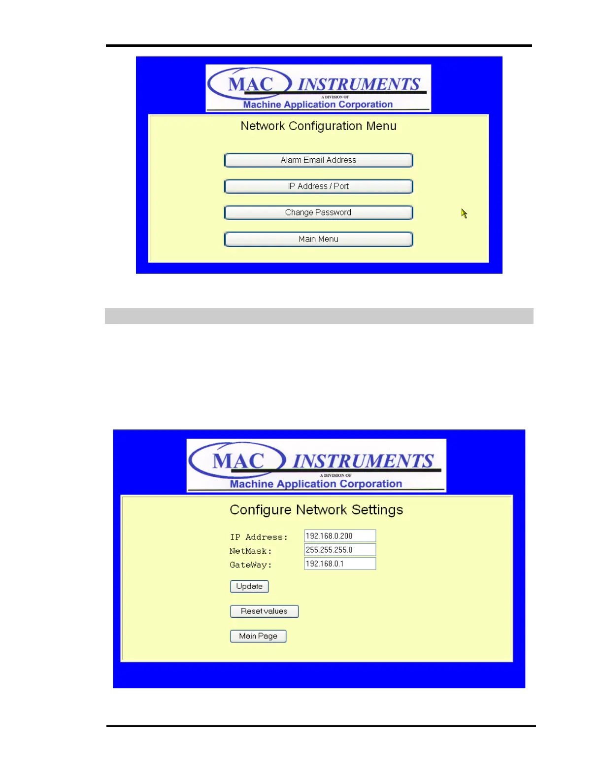 This menu changes the default IP address of the MAC155 to an IP address