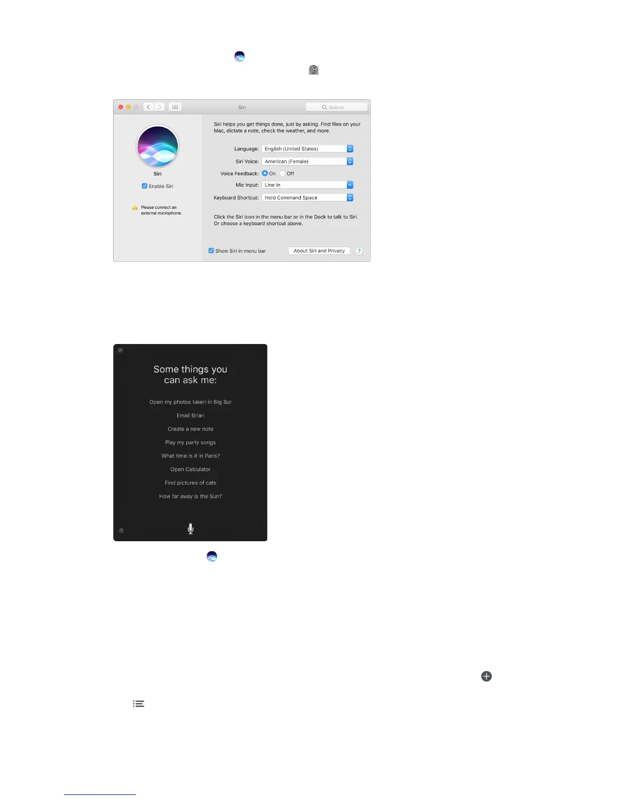 Note: To use Siri, your Mac mini must be connected to the Internet and a microphone. Siri may