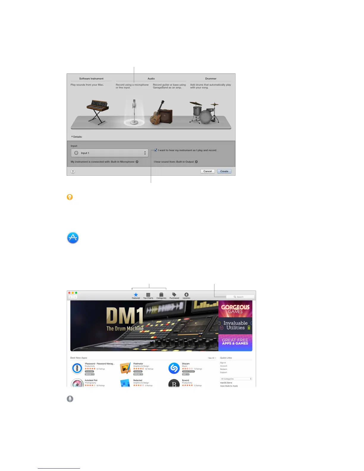 Record your voice. Connect a microphone (sold separately), choose Track > New Track, then