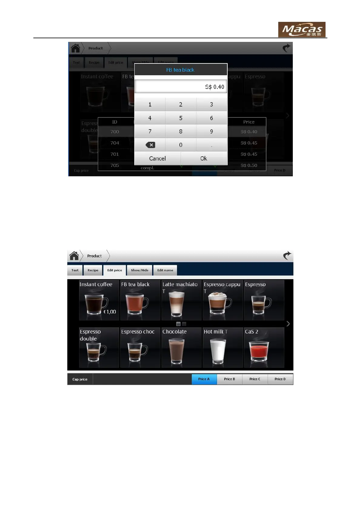 To change cup price: click “Cup price” button, and it shows: