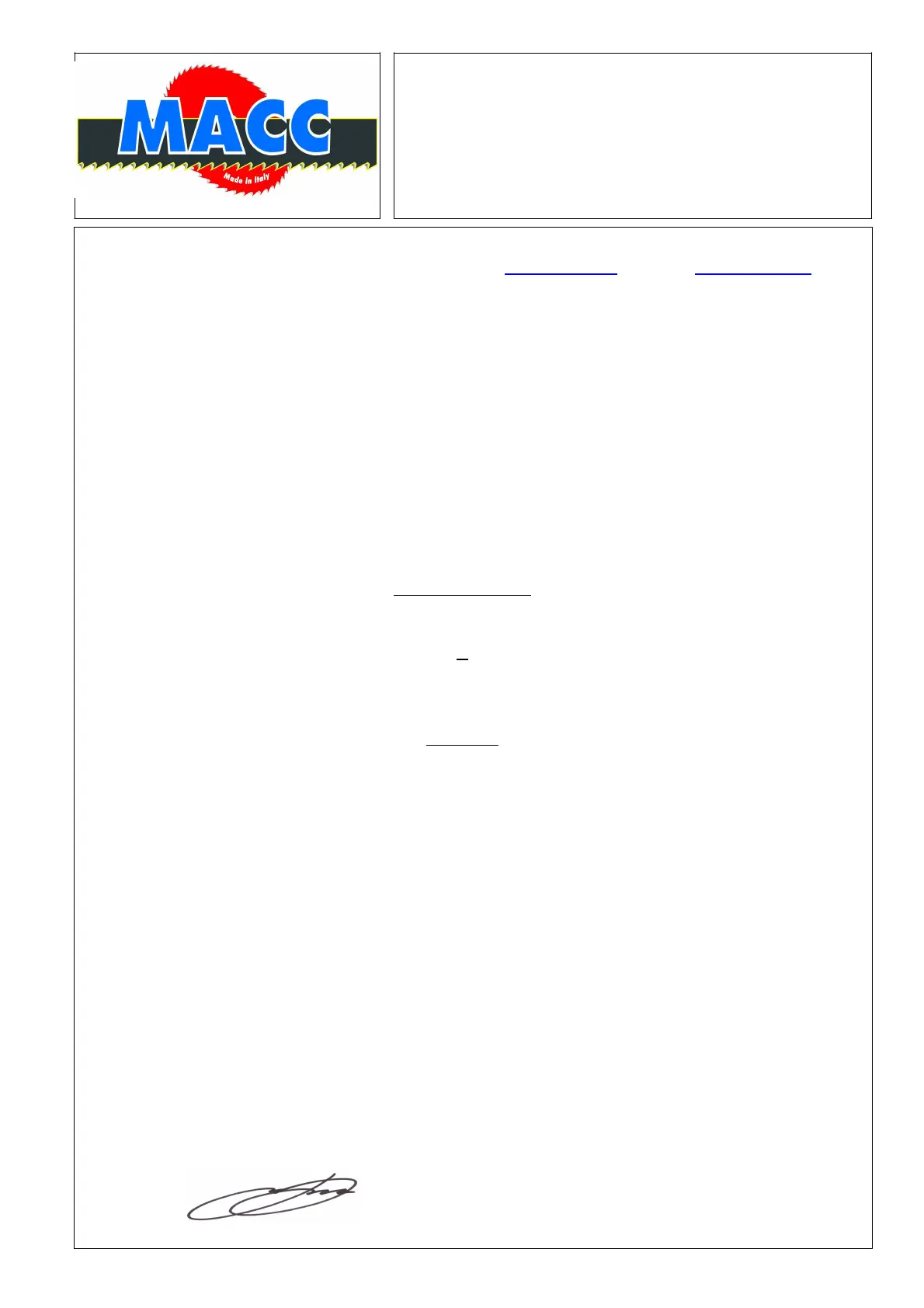 MACC Costruzioni Meccaniche s.r.l. - Via Lago di Albano, 10 – 36015 Schio (VI) Italy Tel.: 0445/575005 Fax: 0445/575006