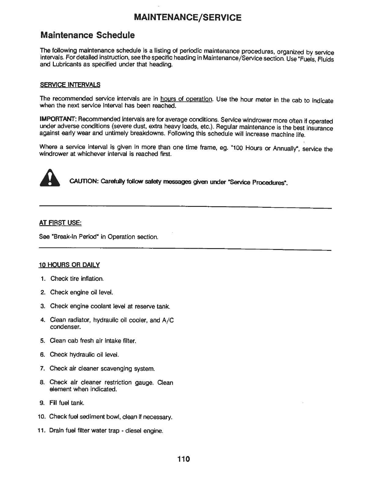 : Recommended intervals are for average conditions. Service windrower more often if operated