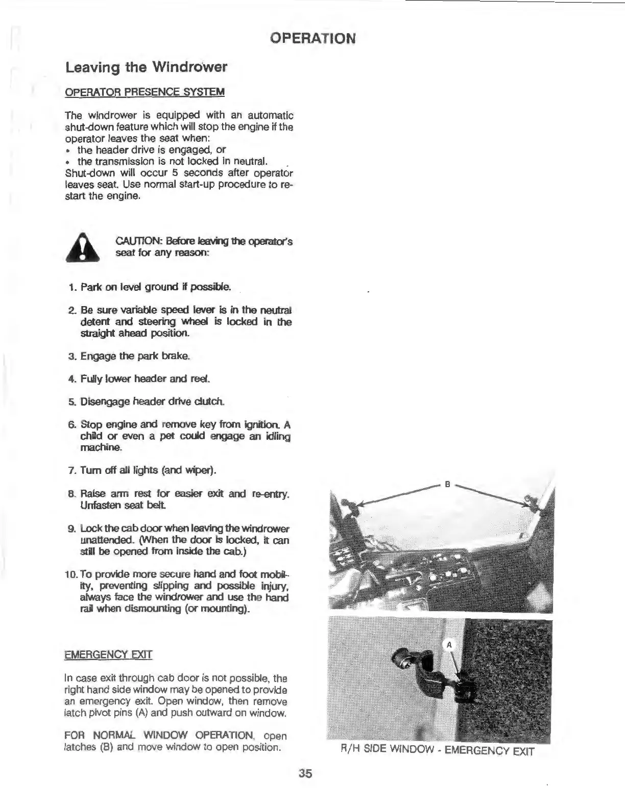 MacDon 9000 - Leaving the Windrower; Operator Presence System; Emergency Exit