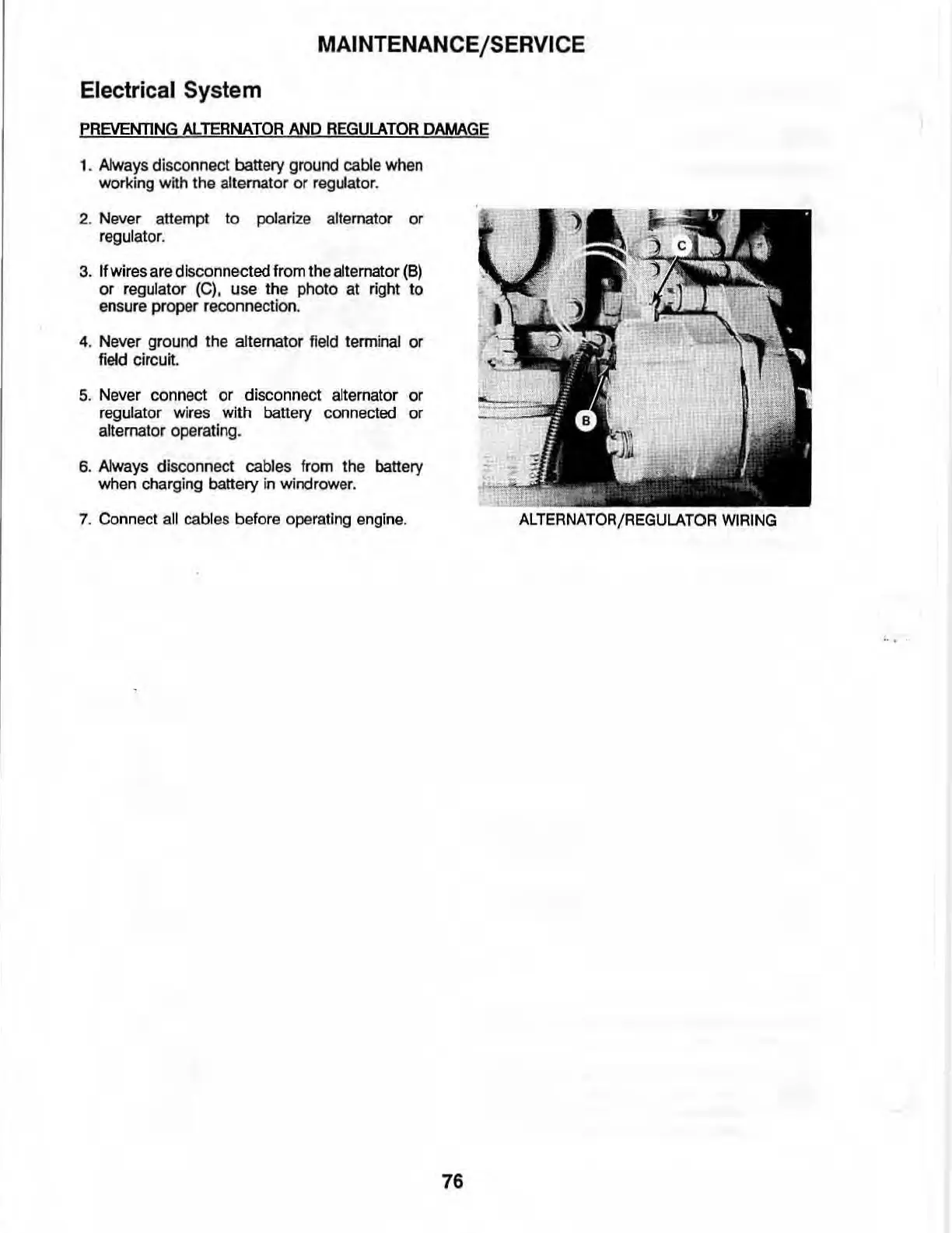 5. Never connect or disconnect alternator or