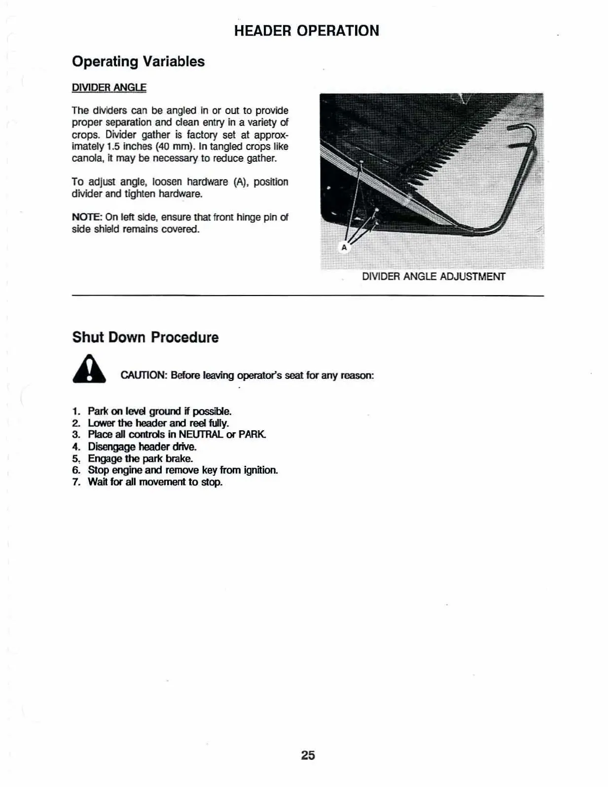 MacDon 960 - Divider Angle; Shut-Down Procedure