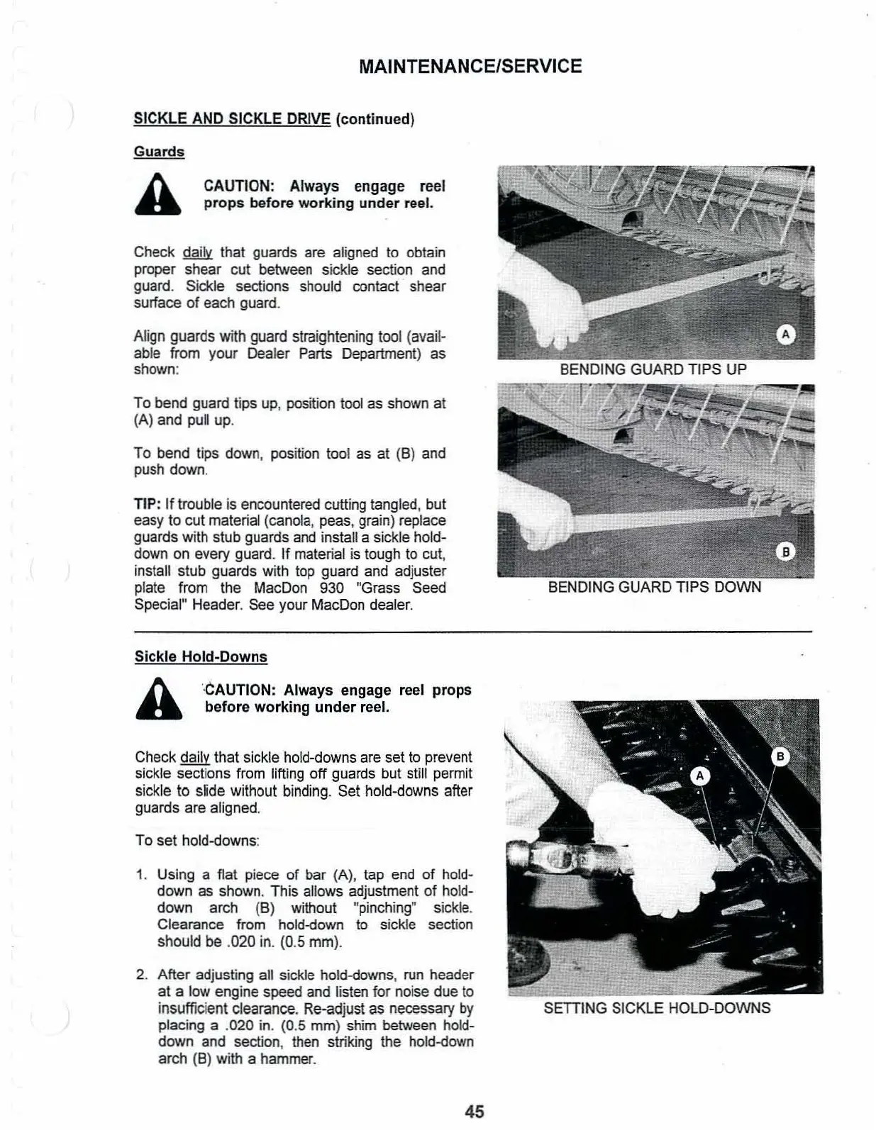 Check daily that sickle hold-downs are set to prevent
