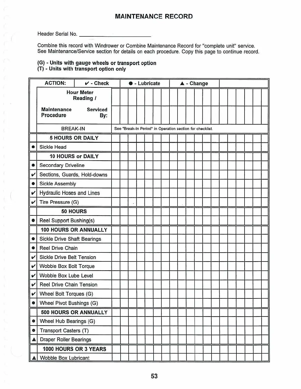 MacDon 960 - Maintenance Record; Hours or Daily