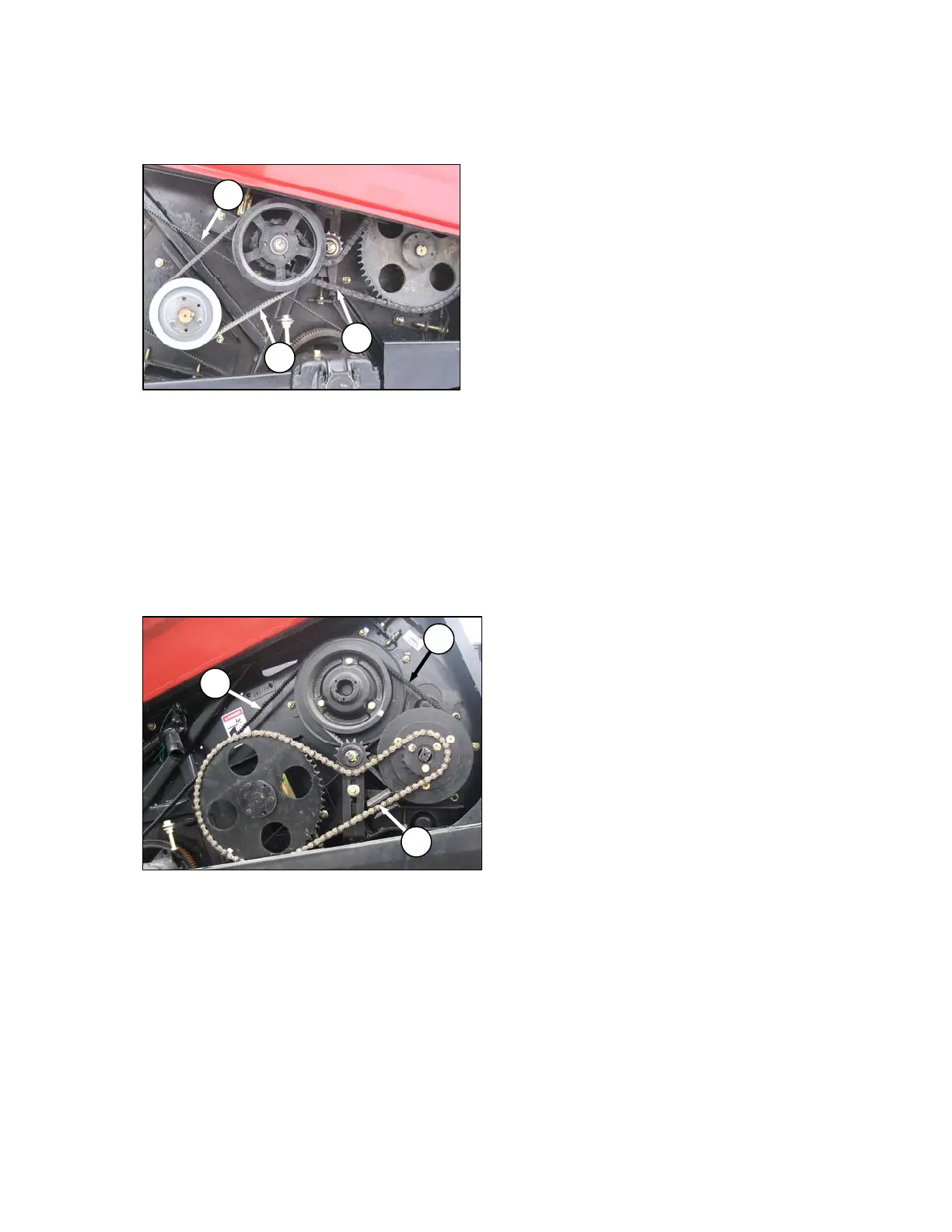 d. Sickle drive belt (C) should deflect 11/20 in.