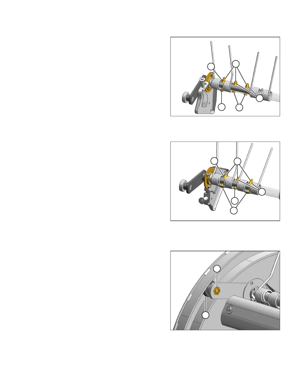 14. Install bolts (D), spacers (B), and nuts (C) between the tines