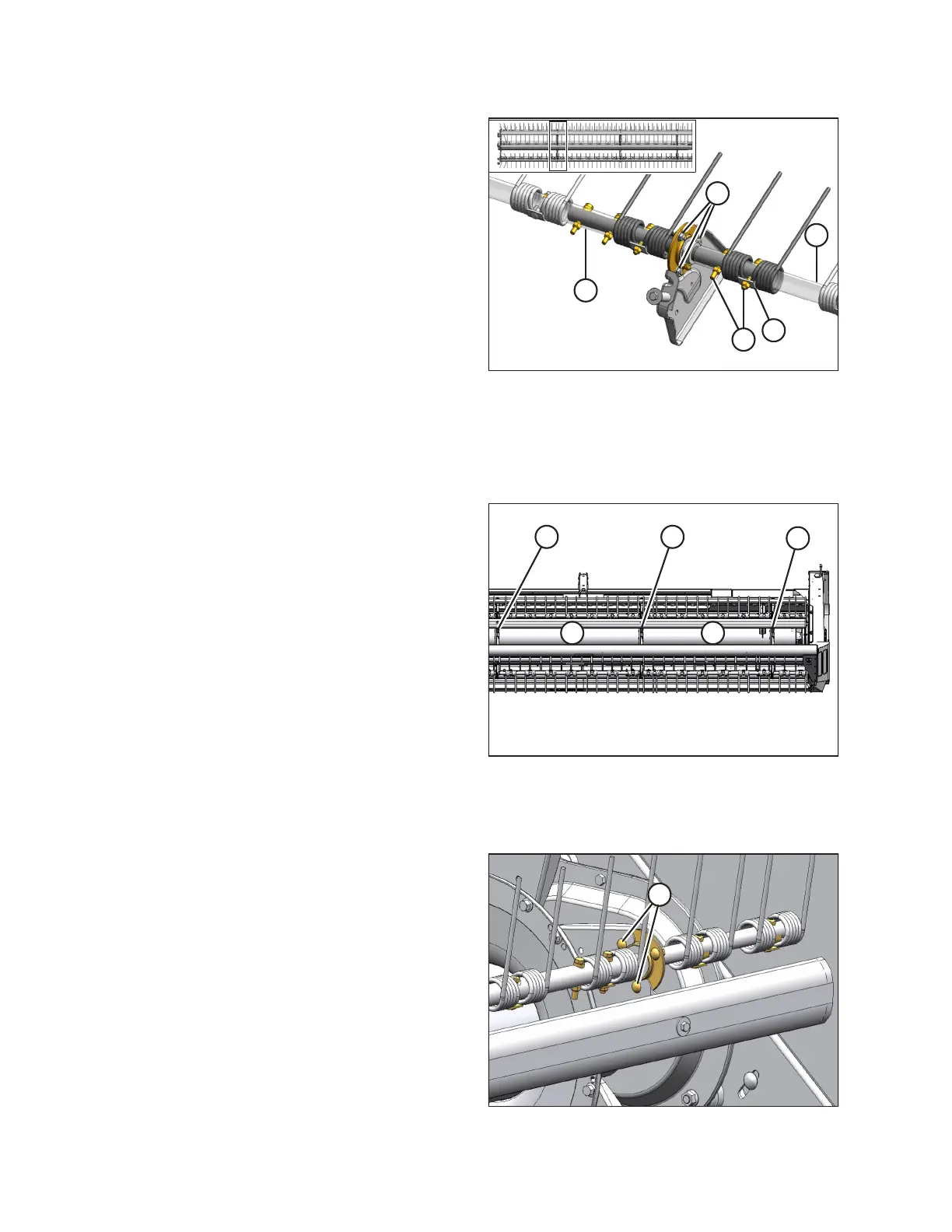 24. Secure the tine onto center tine bar (E) with shoulder