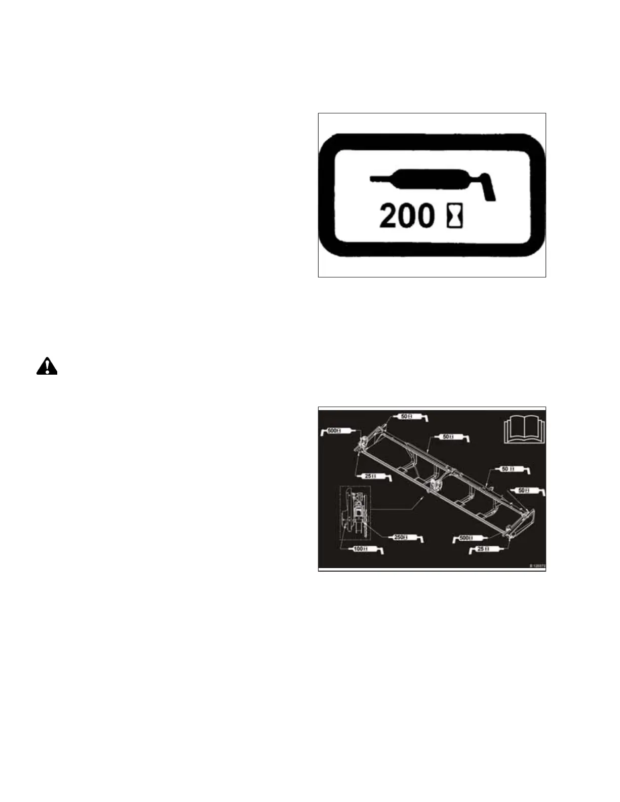 Greasing points are marked on the machine by decals showing a grease gun and the grease interval in hours of operation.