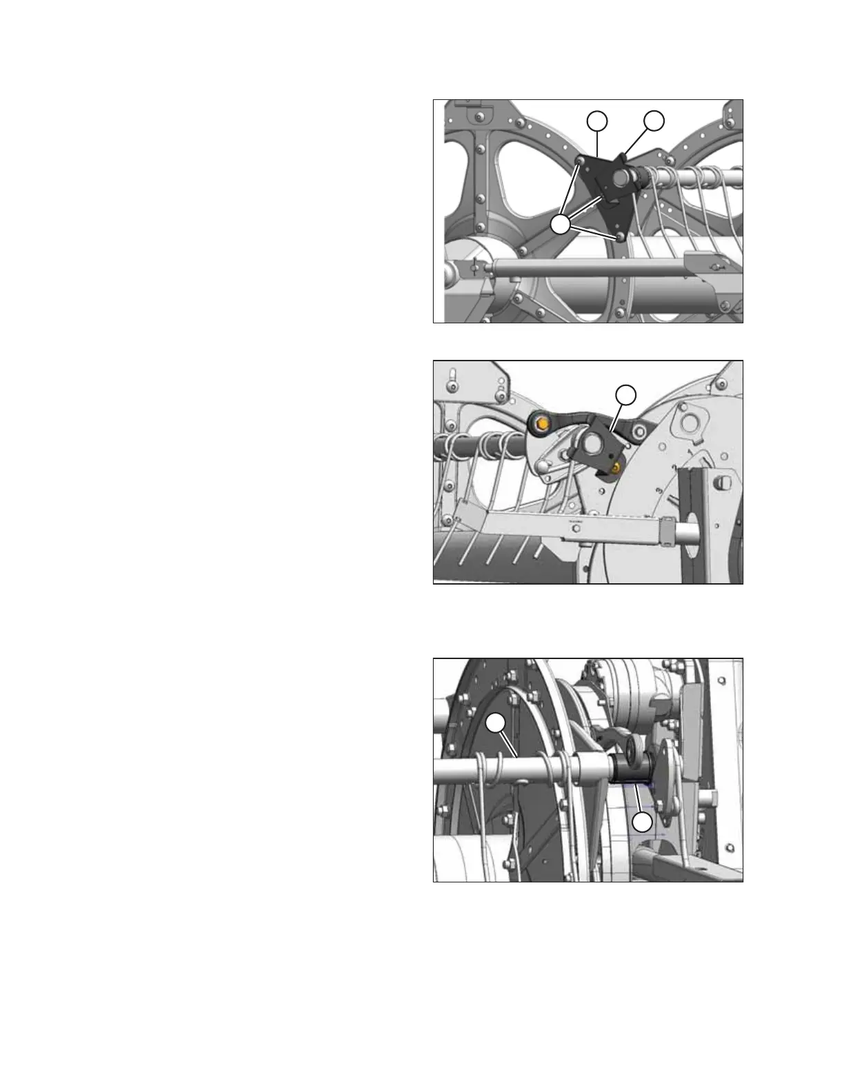 8. Install bolts (A) securing tine tube arm (B) to the