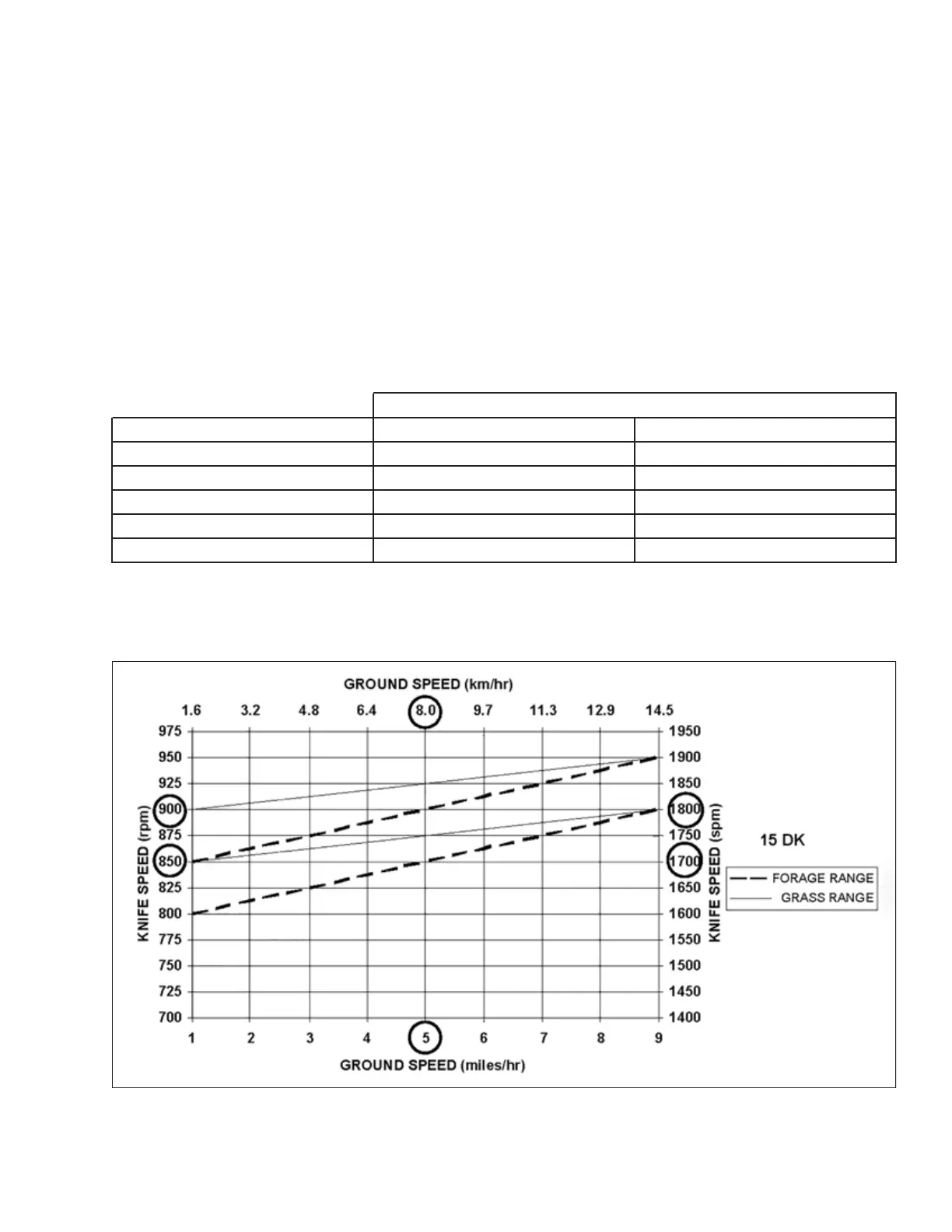 Example: Cutting forage at 8.0 km/hr (5.0 mph), use a knife speed between 850 and 900 rpm (1700 and 1800 spm).