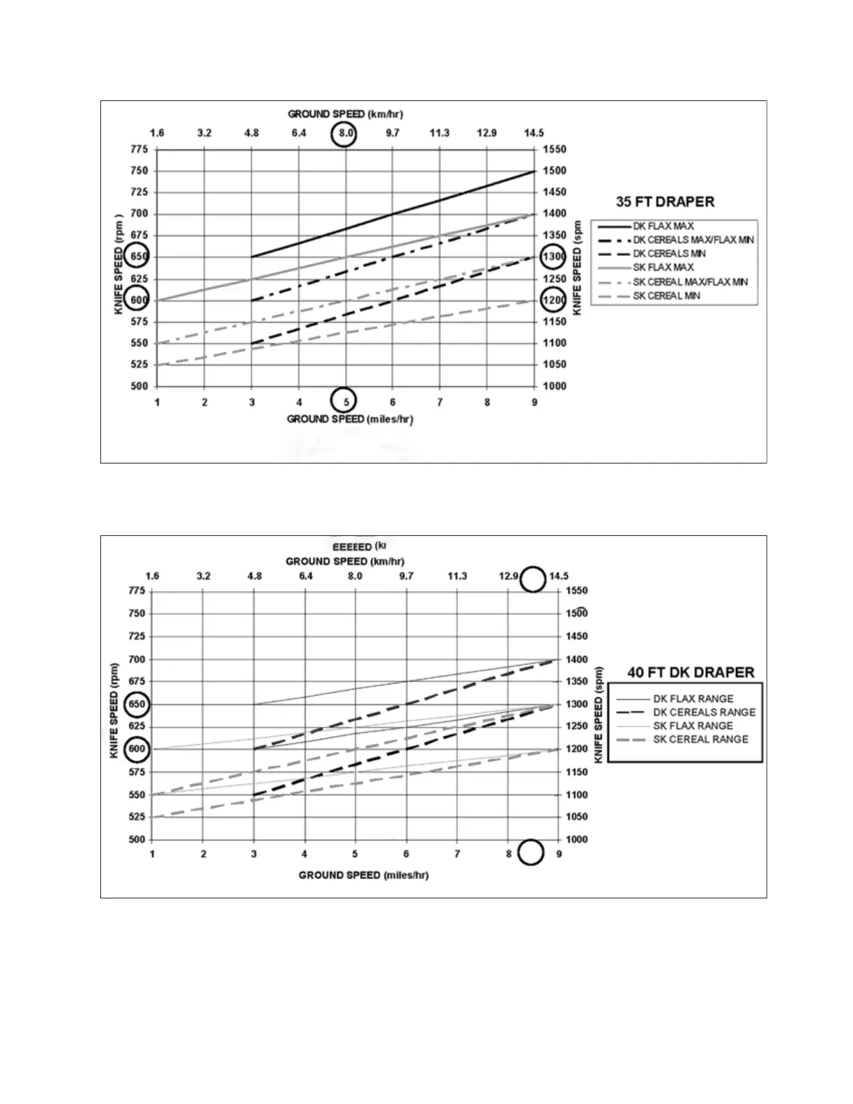 Example: Cutting flax at 8.0 km/hr (5.0 mph) with a single-knife header, use a knife speed between 600 and 650 rpm (1200