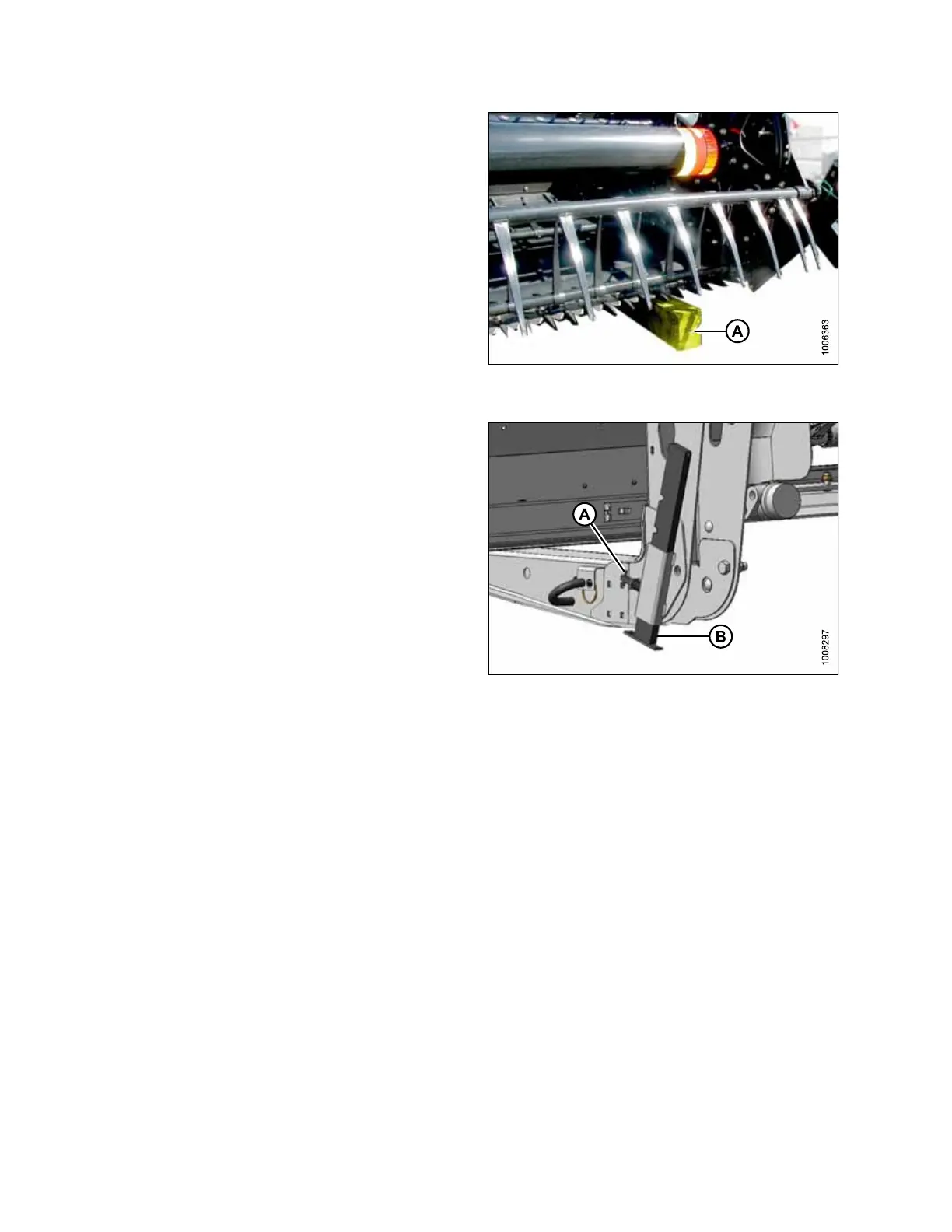 8. Lower header stand: pull pin (A), lower stand (B), and