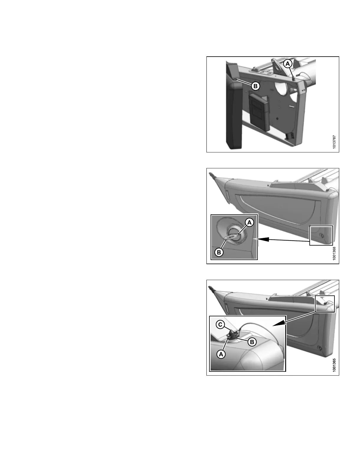 5. Replace tool (B) and lynch pin (A) on top pin (C).