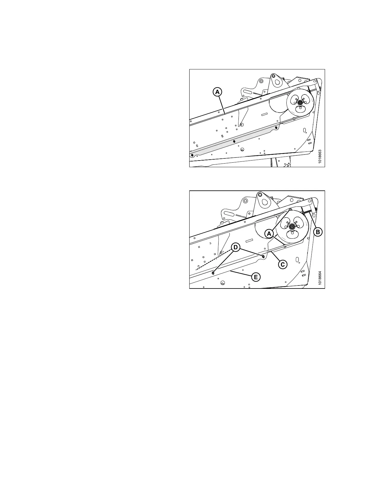 7. Loosen three bolts (D), and adjust position of guide (E)