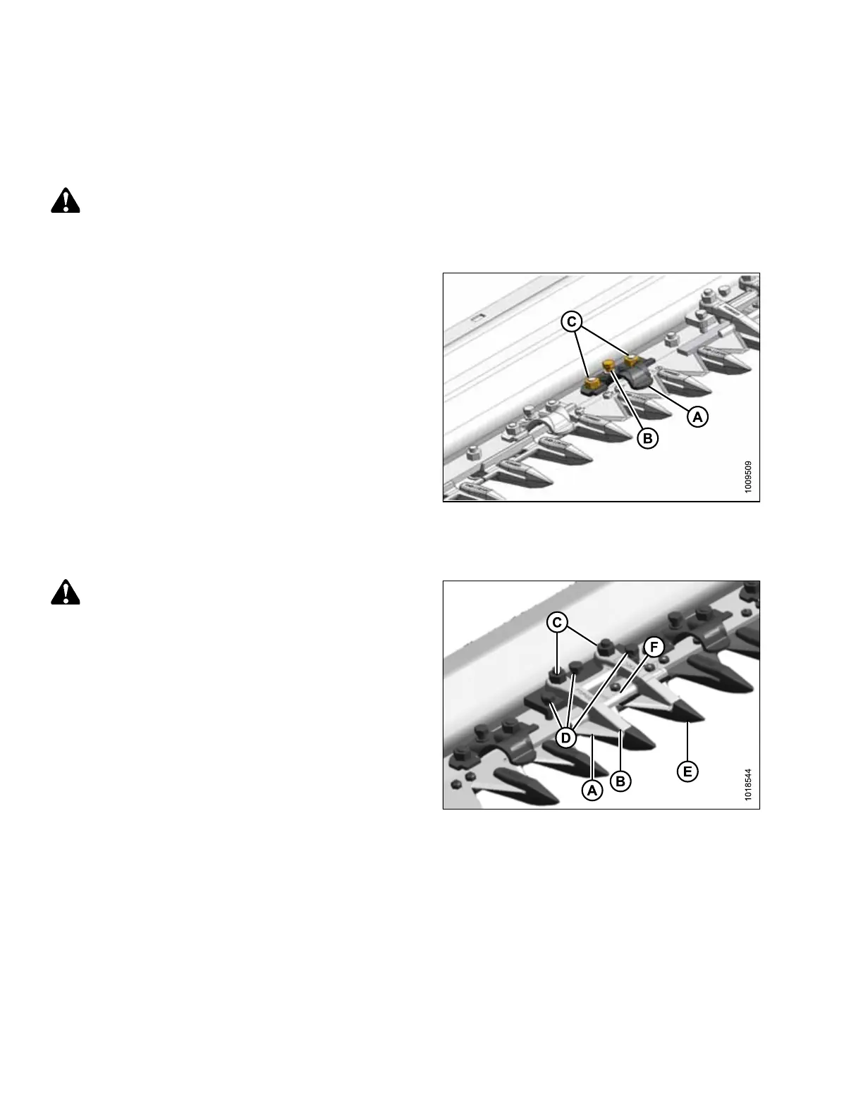 5. Turn bolts (D) until they contact cutterbar, then tighten