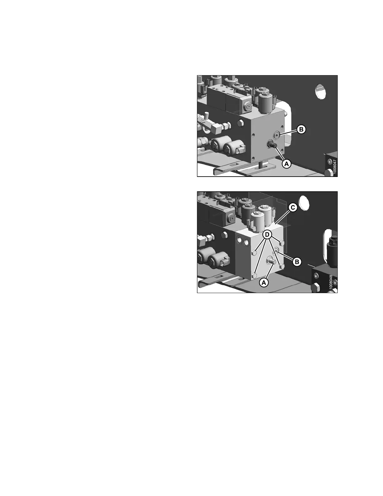 1. Remove fitting (A) and plug (B) from the lift manifold