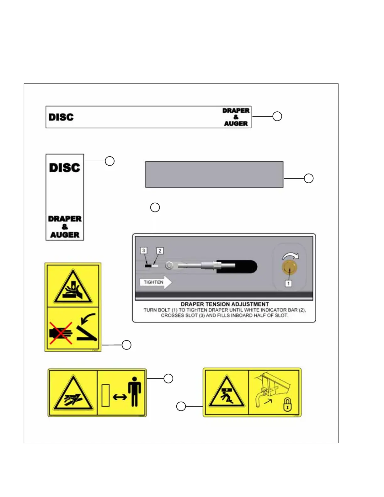 This section lists the safety decals on a Double Windrow Attachment (DWA) on an M series windrower.