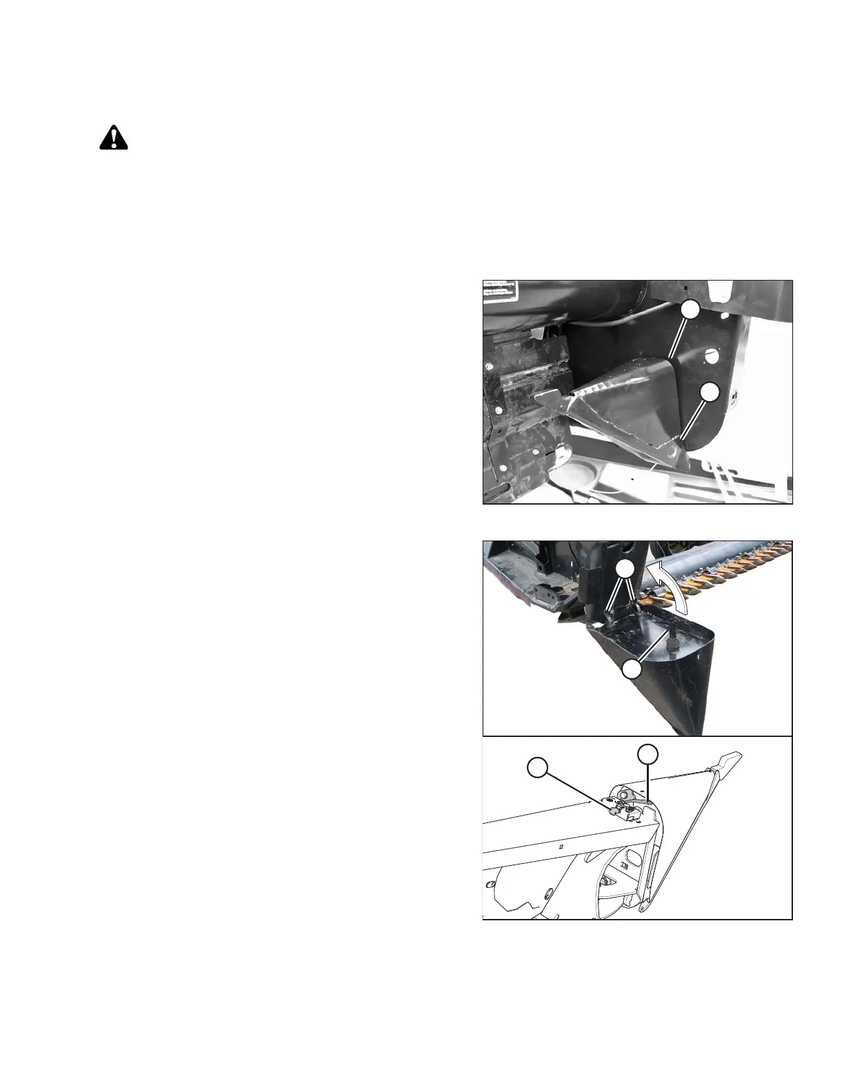 1. Lower reel, raise header, stop engine, remove key, and engage safety props. Refer to your combine operator’s