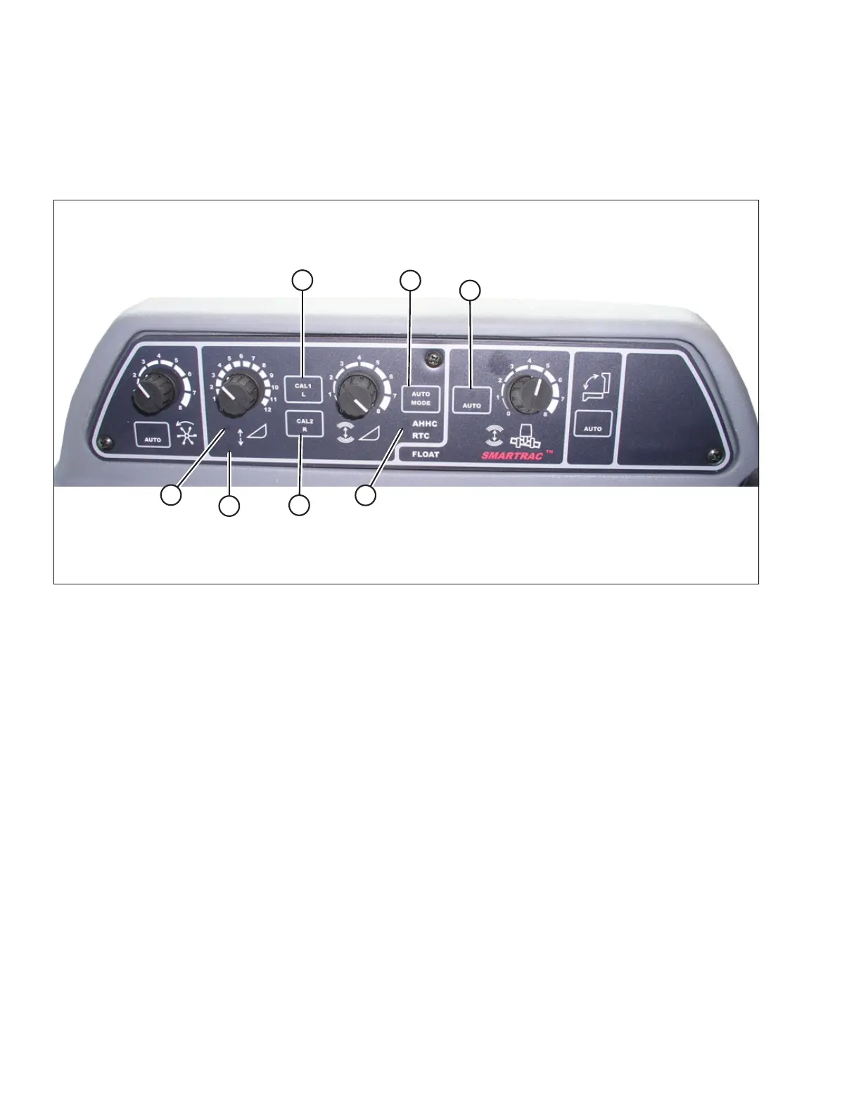 3. Press and hold CAL1 button (C) until you see following lights flash: raise header (D), lower header (E), tilt auto