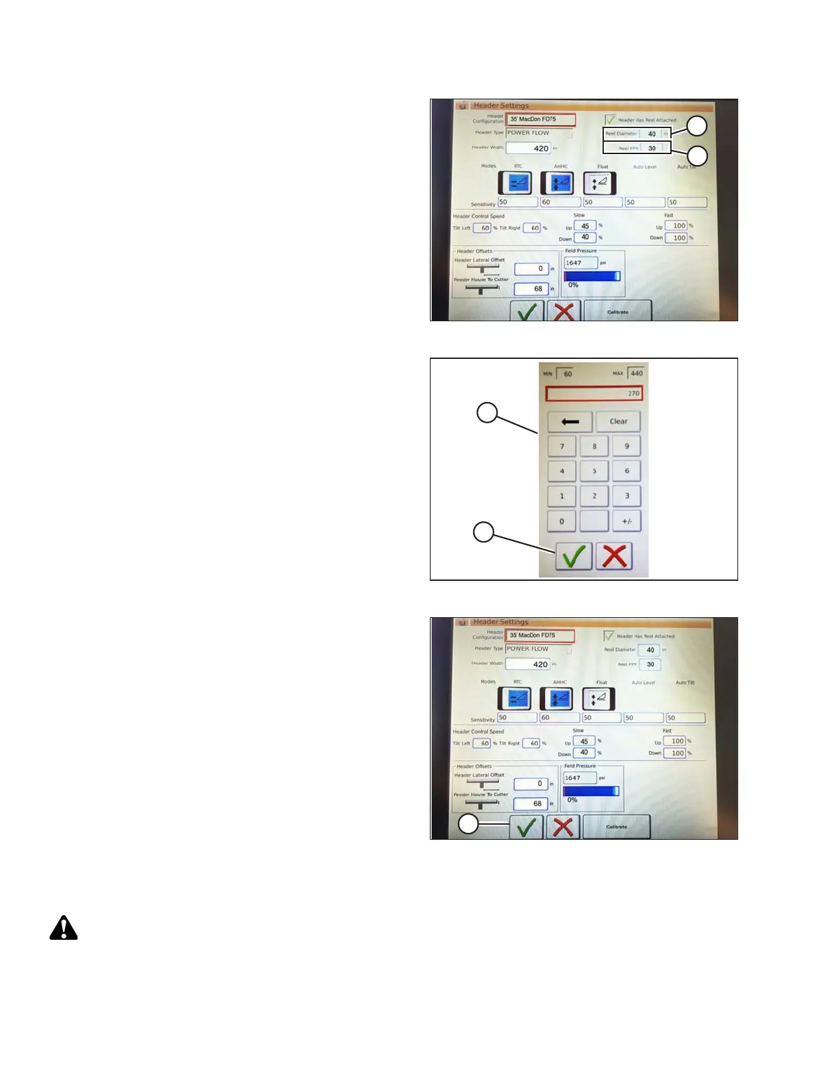 keypad displays. Enter 40 as MacDon Reel Diameter.