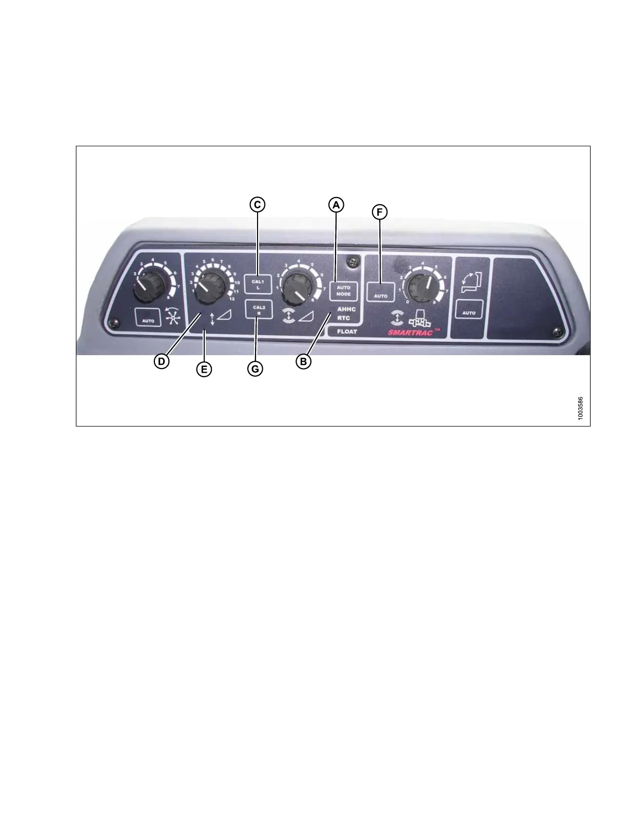 3. Press and hold CAL1 button (C) until you see following lights flash: raise header (D), lower header (E), tilt auto