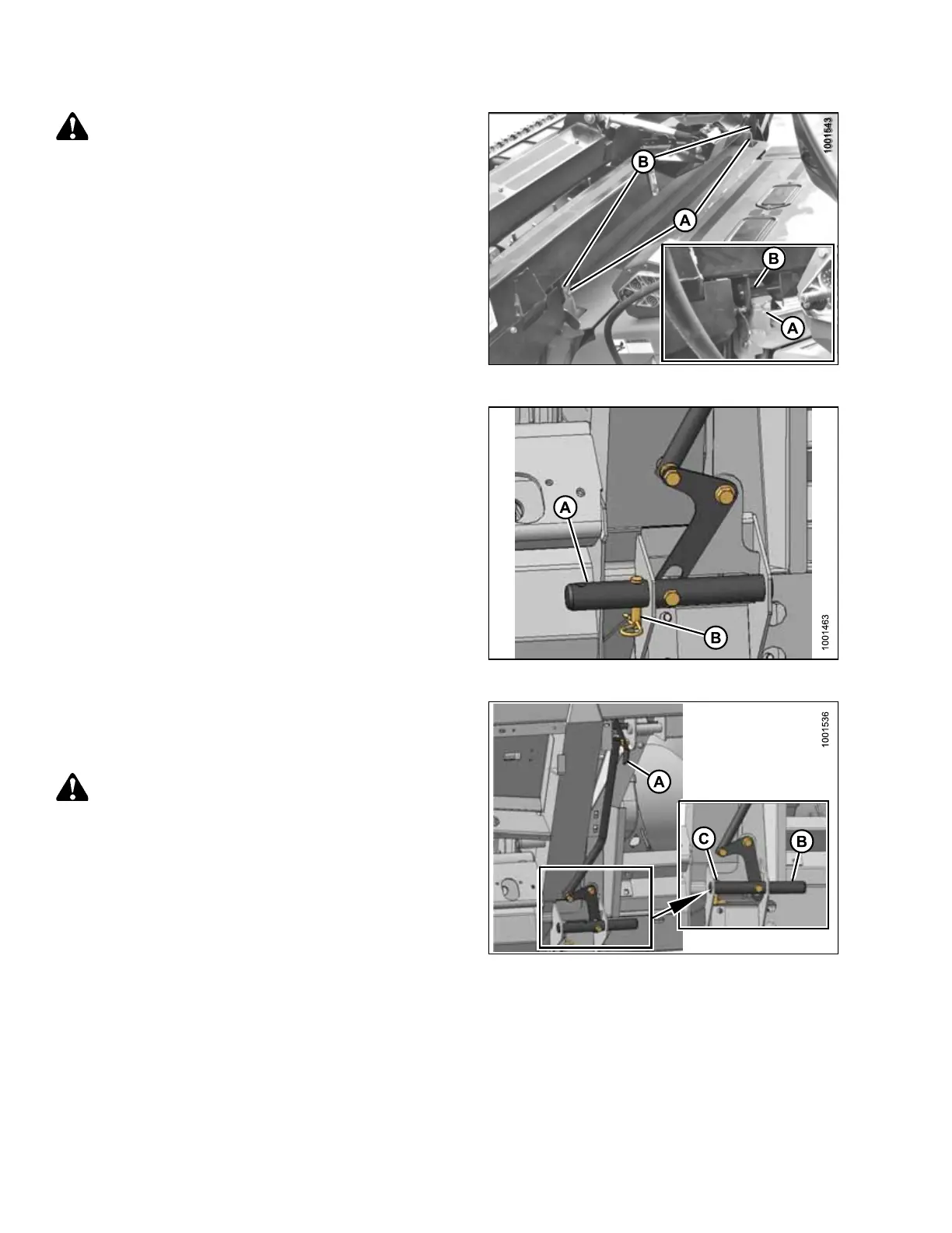 6. Lower handle (A) to engage pins (B) into feeder house.