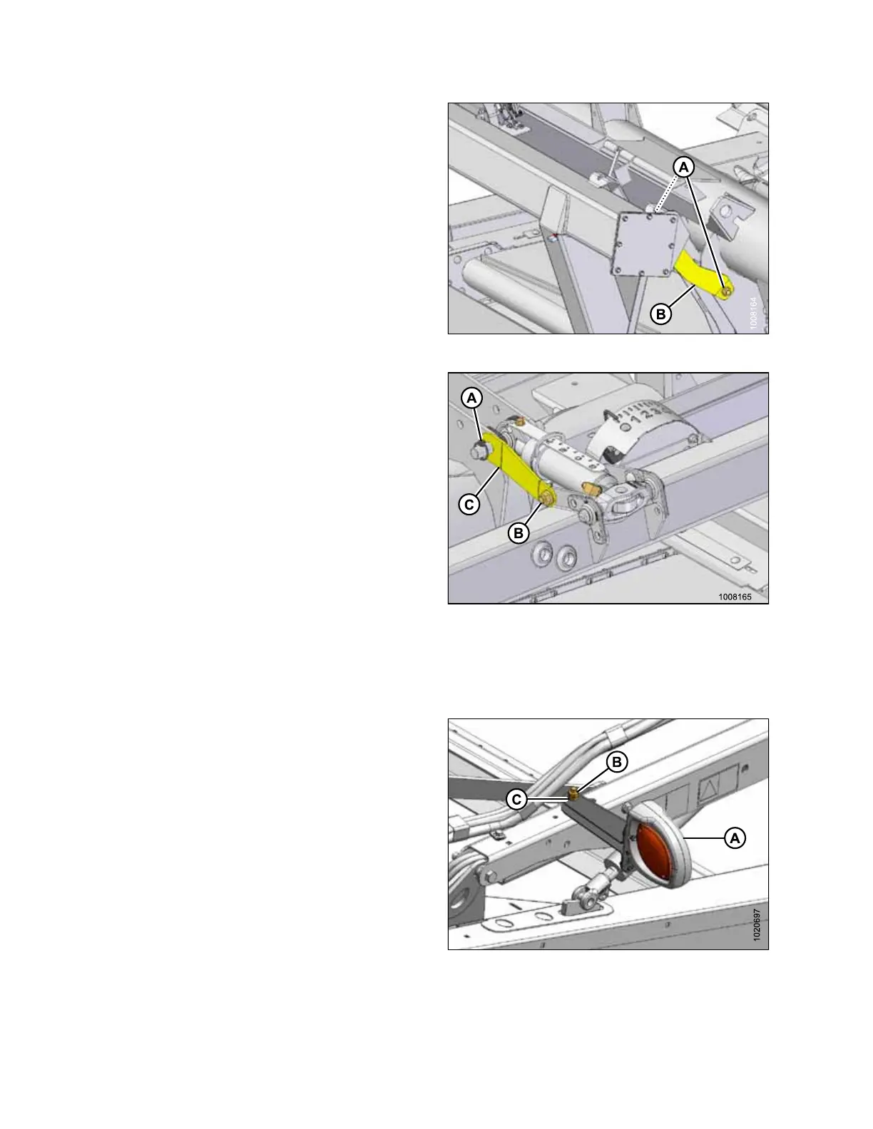 2. Remove lynch pin (A), nut and bolt (B), and remove