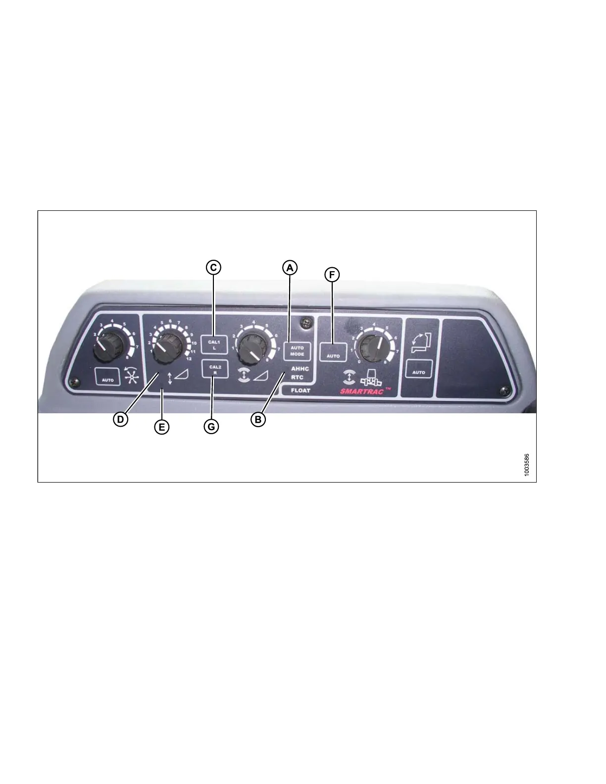 3. Press and hold CAL1 button (C) until you see the following lights flash: raise header (D), lower header (E), tilt