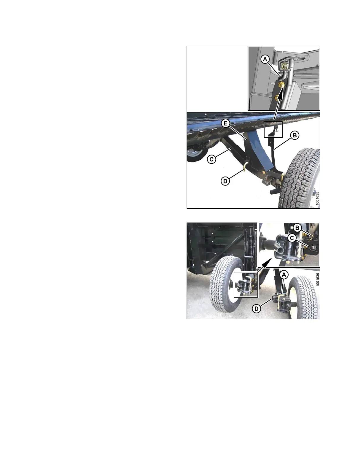 11. Lift wheel, lift latch (C), and engage lug (D) onto left