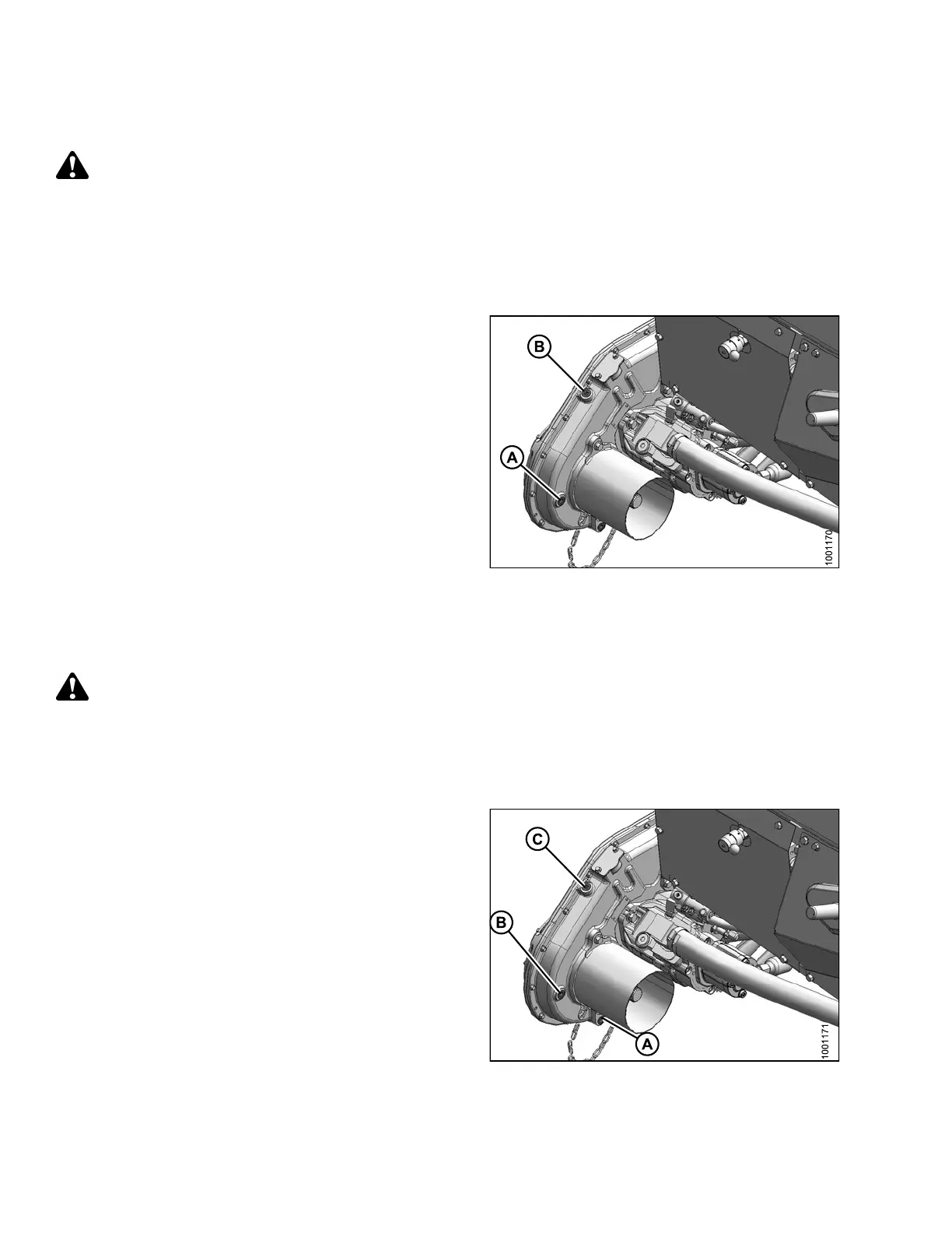 6. Replace oil level plug (B) a nd fille r plug (C).