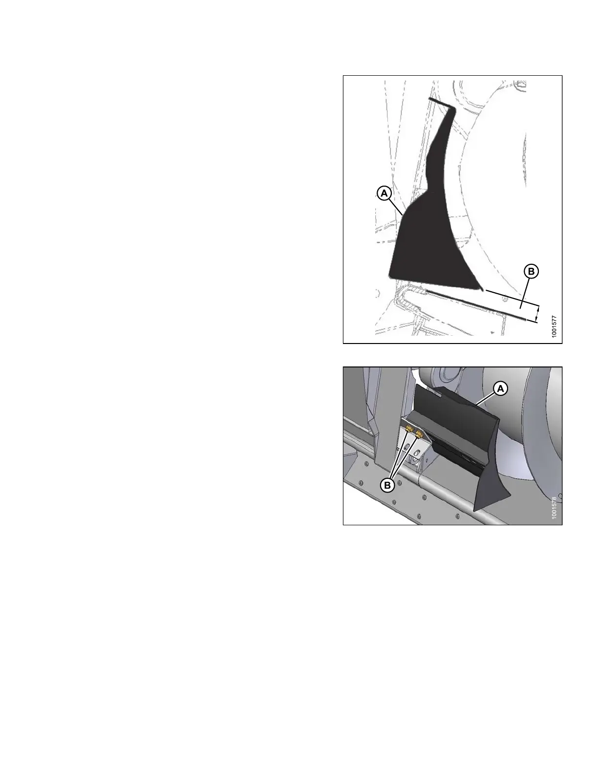3. Remove two bolts and nuts (B) securing deflec tor (A)