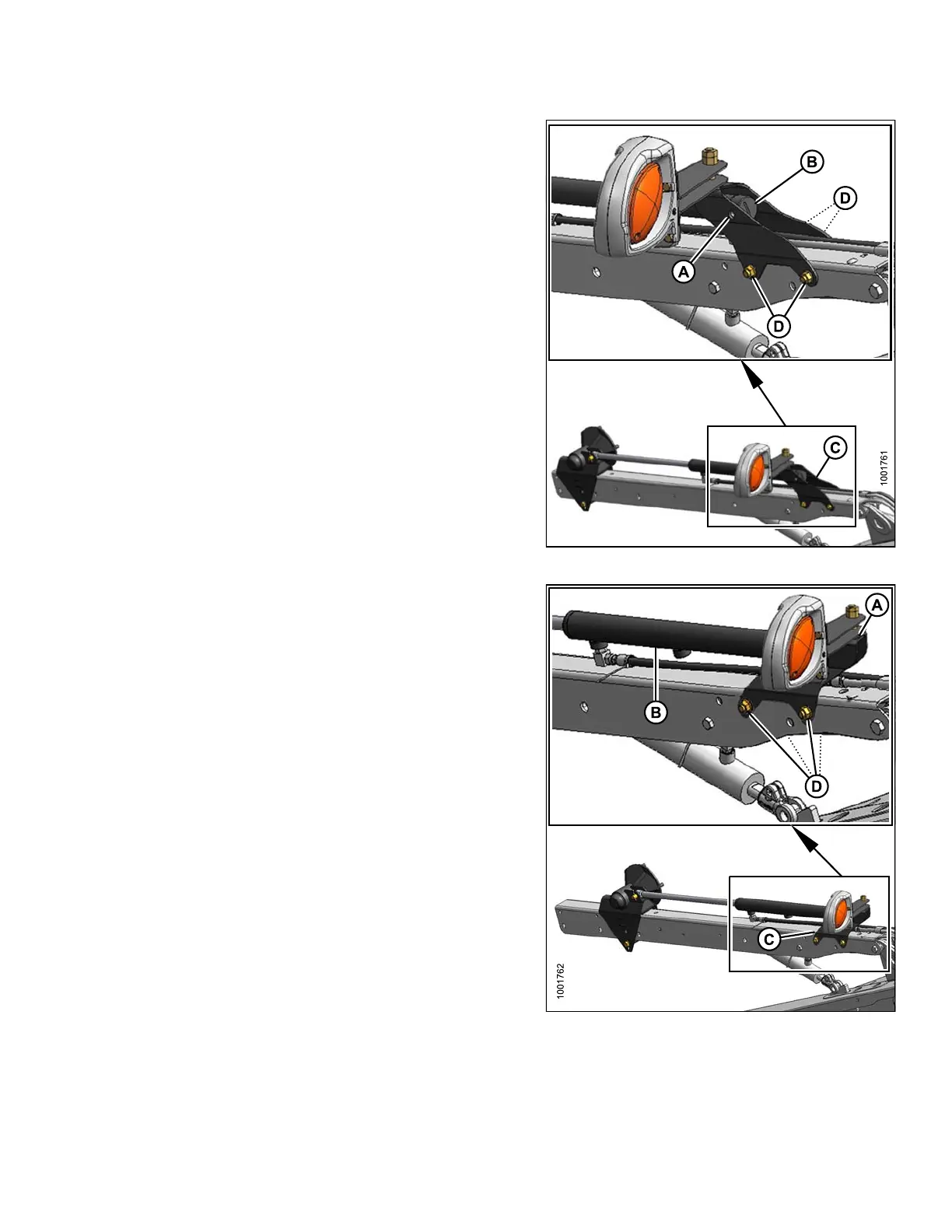 10. Remove bolts (D) securing bracket (C) to reel arm and