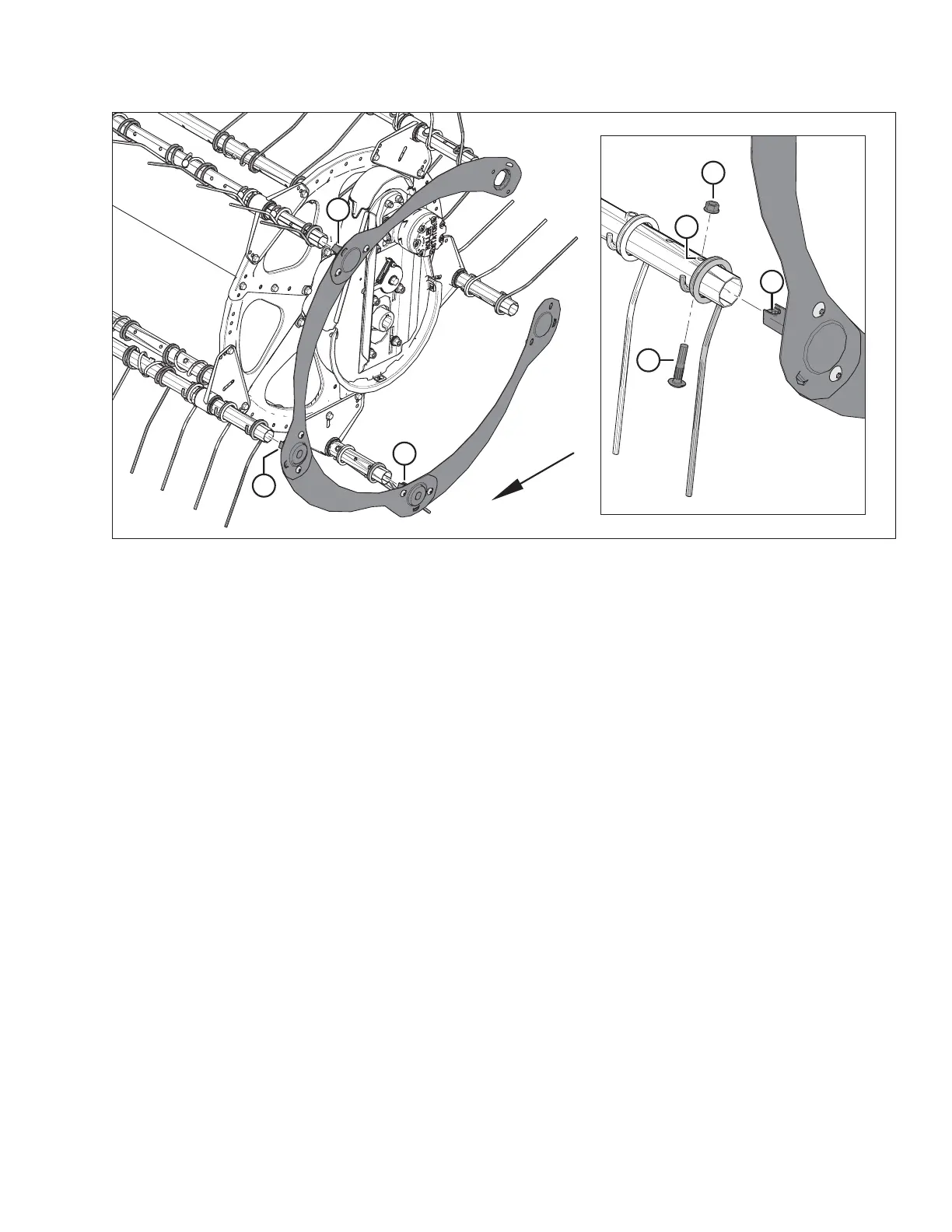 b. Secure the bushings and fingers to the tine tube using bolt (D) and nut (E). Do NOT tighten.