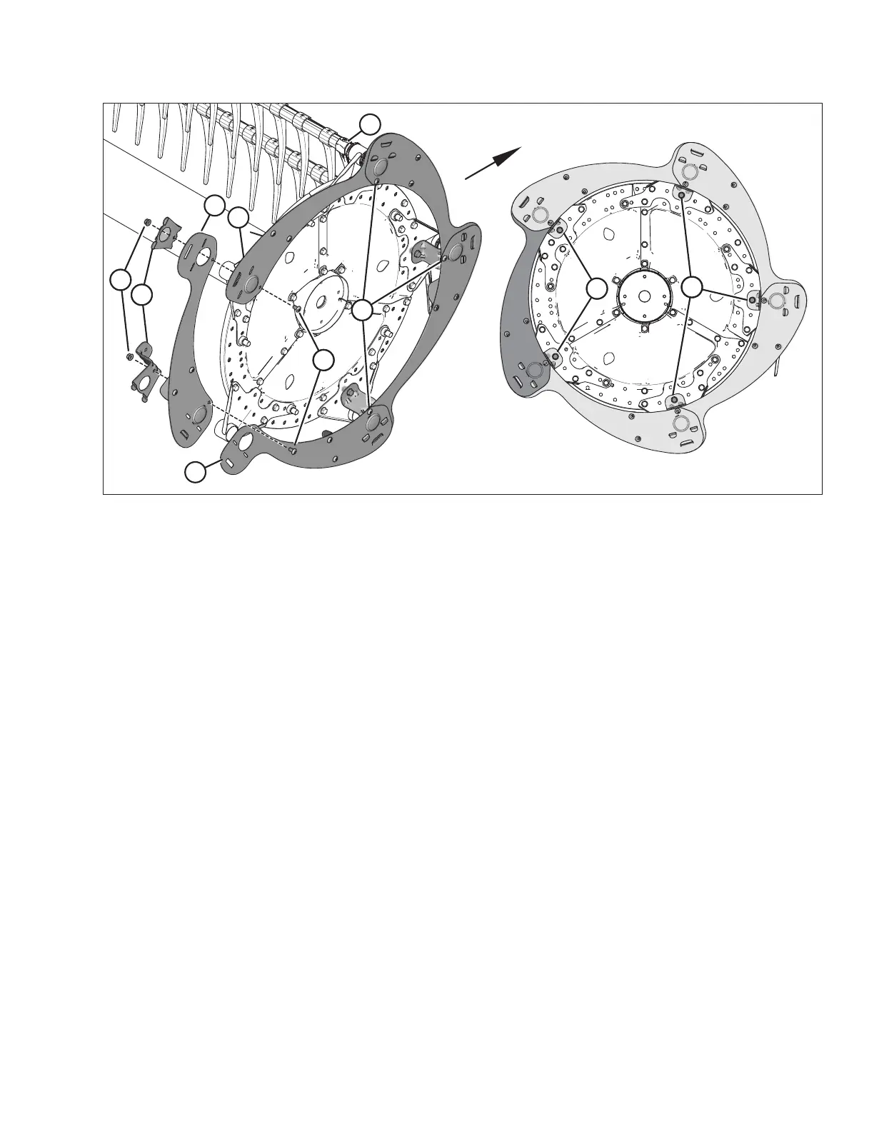 8. Secure the two endshield supports to the reel disc using two M12 X 1.75 X 30 hex bolts (J) and nuts.