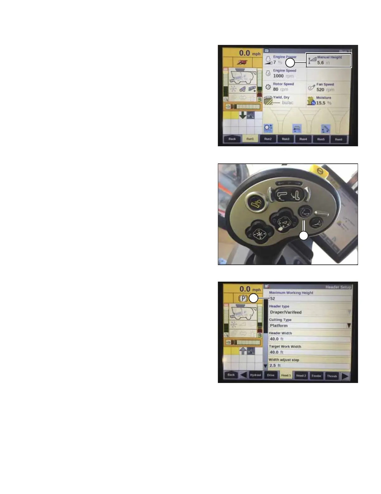 HEIGHT box (A) on the RUN 1 page on the combine display.