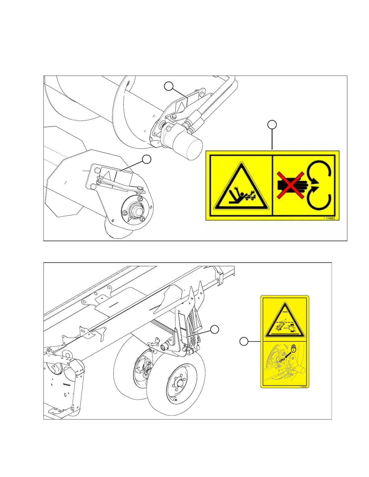 Safety decals are installed in several locations on the header. Replace any missing or damaged decals on the machine with