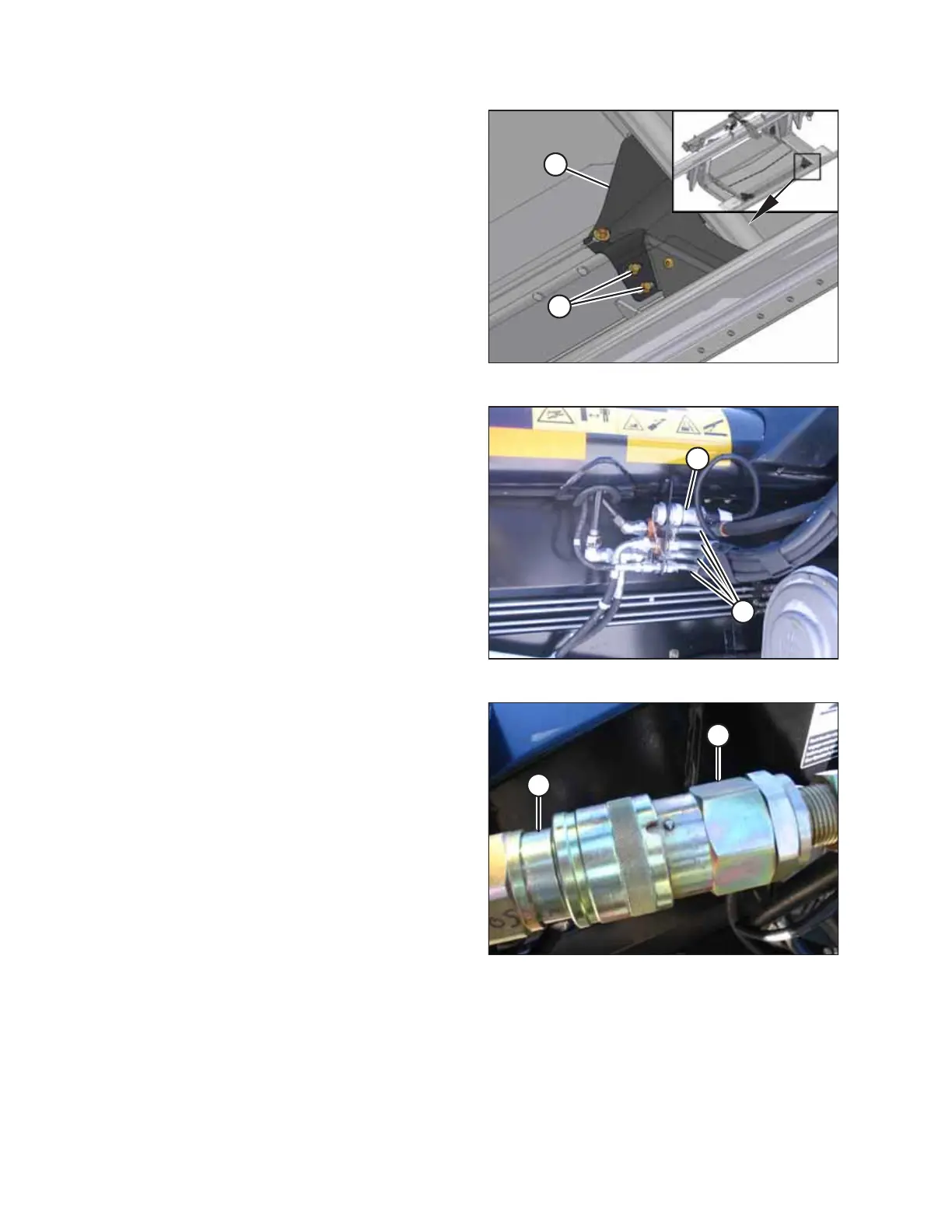 32. Connect the knife and draper drive hydraulic hoses (B) at
