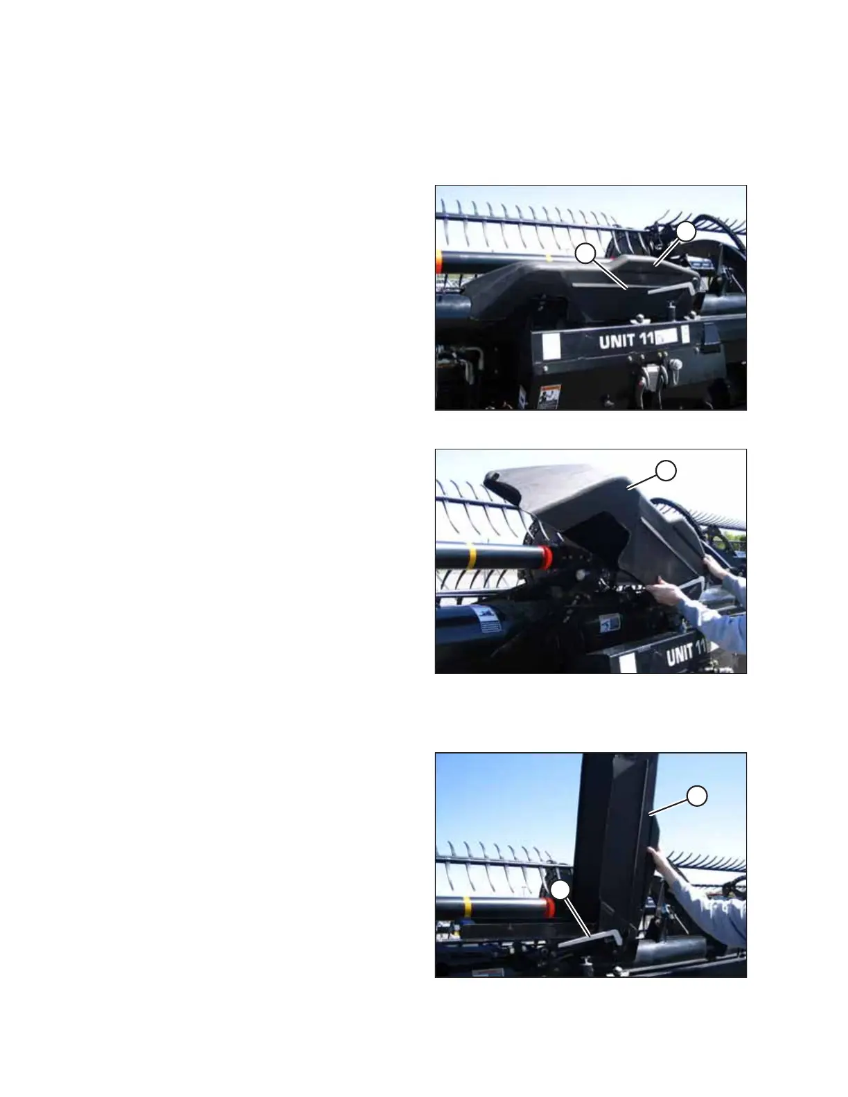 Plastic covers are attached to the header frame to protect the header wing balance mechanism from debris and weather.